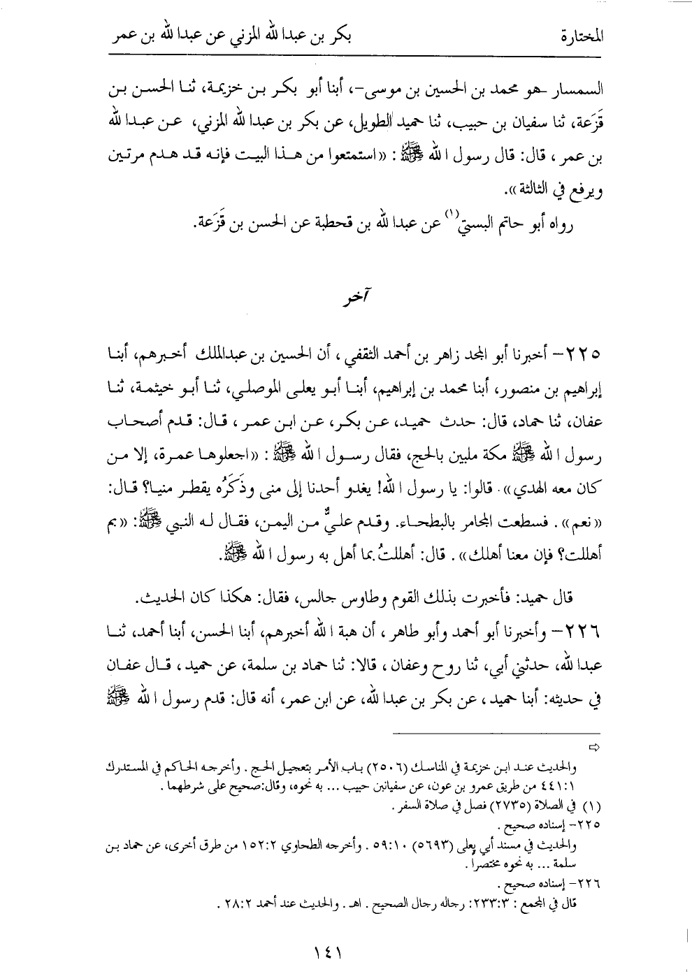 ٢٢٥ - أَخْبَرَنَا أَبُو الْمَجْدِ زَاهِرُ بْنُ أَحْمَدَ الثَّقَفِيُّ، أَنَّ الْحُسَيْنَ بْنَ عَبْدِ الْمَلِكِ أَخْبَرَهُمْ، أَبْنَا إِبْرَاهِيمُ بْنُ مَنْصُورٍ، أَبْنَا مُحَمَّدُ بْنُ إِبْرَاهِيمَ، أَبْنَا أَبُو يَعْلَى الْمَوْصِلِيُّ، ثَنَا أَبُو خَيْثَمَةَ، ثَنَا عَفَّانُ، ثَنَا حَمَّادٌ، قَالَ: حَدَّثَ حُمَيْدٌ، عَنْ بَكْرٍ، عَنِ ابْنِ عُمَرَ، قَالَ: «قَدِمَ أَصْحَابُ رَسُولِ اللهِ صَلَّى اللهُ عَلَيْهِ وَسَلَّمَ مَكَّةَ مُلَبِّينَ بِالْحَجِّ، فَقَالَ رَسُولُ اللهِ صَلَّى اللهُ عَلَيْهِ وَسَلَّمَ: اجْعَلُوهَا عُمْرَةً، إِلَّا مَنْ كَانَ مَعَهُ الْهَدْيُ قَالُوا: يَا رَسُولَ اللهِ! يَغْدُو أَحَدُنَا إِلَى مِنًى وَذَكَرُهُ يَقْطُرُ مَنِيًّا؟ قَالَ: نَعَمْ فَسَطَعَتِ الْمَجَامِرُ بِالْبَطْحَاءِ. وَقَدِمَ عَلِيٌّ مِنَ الْيَمَنِ، فَقَالَ لَهُ النَّبِيُّ صَلَّى اللهُ عَلَيْهِ وَسَلَّمَ: بِمَ أَهْلَلْتَ؟ فَإِنَّ مَعَنَا أَهْلَكَ. قَالَ: أَهْلَلْتُ بِمَا أَهَلَّ بِهِ رَسُولُ اللهِ صَلَّى اللهُ عَلَيْهِ وَسَلَّمَ».
