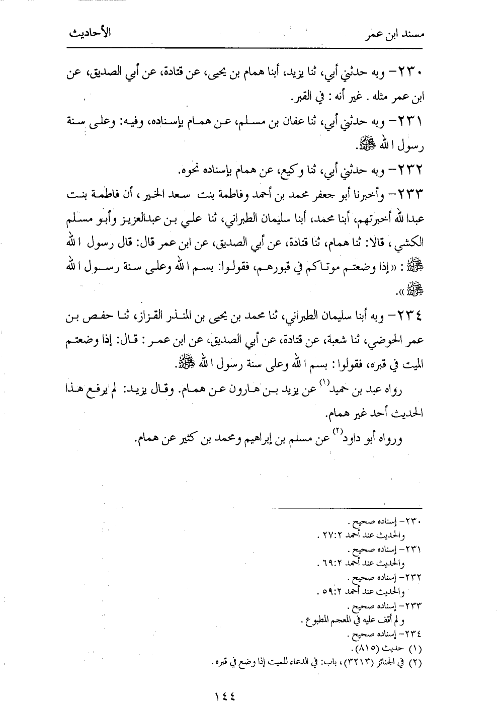 ٢٣٠ - وَبِهِ حَدَّثَنِي أَبِي، ثَنَا يَزِيدُ، أَبْنَا هَمَّامُ بْنُ يَحْيَى، عَنْ قَتَادَةَ، عَنْ أَبِي الصِّدِّيقِ، عَنِ ابْنِ عُمَرَ - مِثْلَهُ، غَيْرَ أَنَّهُ: فِي الْقَبْرِ.