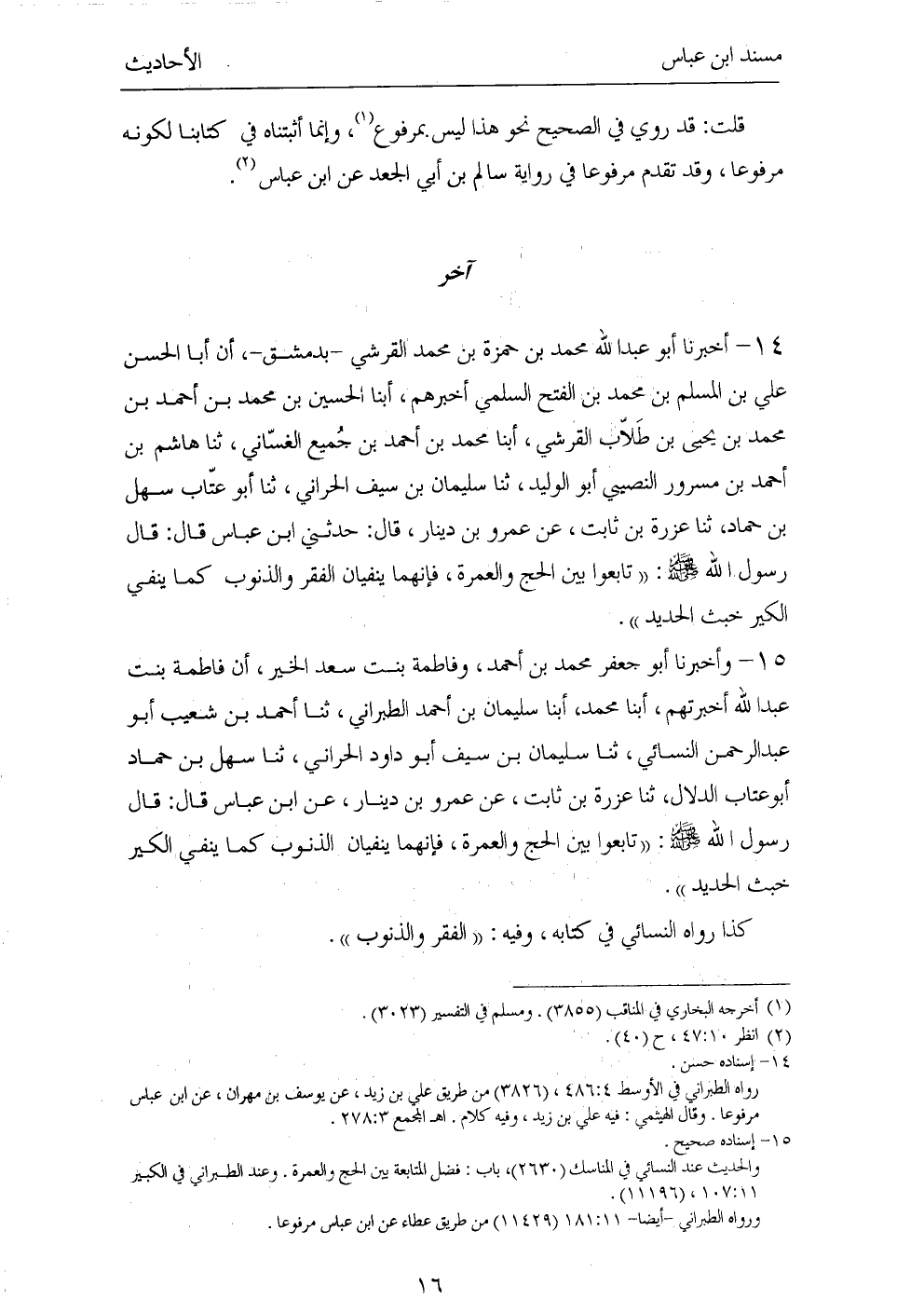١٥ - وَأَخْبَرَنَا أَبُو جَعْفَرٍ مُحَمَّدُ بْنُ أَحْمَدَ، وَفَاطِمَةُ بِنْتُ سَعْدِ الْخَيْرِ، أَنَّ فَاطِمَةَ بِنْتَ عَبْدِ اللهِ أَخْبَرَتْهُمْ، أَبْنَا مُحَمَّدٌ، أَبْنَا سُلَيْمَانُ بْنُ أَحْمَدَ الطَّبَرَانِيُّ، ثَنَا أَحْمَدُ بْنُ شُعَيْبٍ أَبُو عَبْدِ الرَّحْمَنِ النَّسَائِيُّ، ثَنَا سُلَيْمَانُ بْنُ سَيْفٍ أَبُو دَاوُدَ الْحَرَّانِيُّ، ثَنَا سَهْلُ بْنُ حَمَّادٍ أَبُو عَتَّابٍ الدَّلَّالُ، ثَنَا عَزْرَةُ بْنُ ثَابِتٍ، عَنْ عَمْرِو بْنِ دِينَارٍ، عَنِ ابْنِ عَبَّاسٍ قَالَ: قَالَ رَسُولُ اللهِ صَلَّى اللهُ عَلَيْهِ وَسَلَّمَ: «تَابِعُوا بَيْنَ الْحَجِّ وَالْعُمْرَةِ، فَإِنَّهُمَا يَنْفِيَانِ الذُّنُوبَ كَمَا يَنْفِي الْكِيرُ خَبَثَ الْحَدِيدِ».