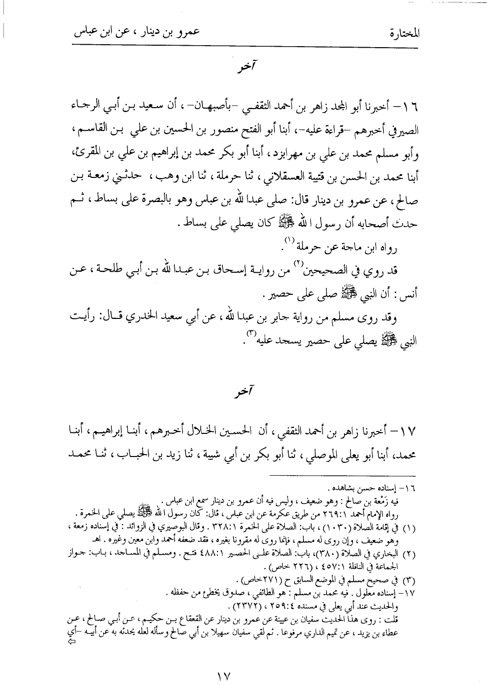 ١٦ - أَخْبَرَنَا أَبُو الْمَجْدِ زَاهِرُ بْنُ أَحْمَدَ الثَّقَفِيُّ - بِأَصْبَهَانَ - أَنَّ سَعِيدَ بْنَ أَبِي الرَّجَاءِ الصَّيْرَفِيَّ أَخْبَرَهُمْ - قِرَاءَةً عَلَيْهِ - أَبْنَا أَبُو الْفَتْحِ مَنْصُورُ بْنُ الْحُسَيْنِ بْنِ عَلِيِّ بْنِ الْقَاسِمِ، وَأَبُو مُسْلِمٍ مُحَمَّدُ بْنُ عَلِيِّ بْنِ مَهْرَابَزْدَ، أَبْنَا أَبُو بَكْرٍ مُحَمَّدُ بْنُ إِبْرَاهِيمَ بْنِ عَلِيِّ بْنِ الْمُقْرِئِ، أَبْنَا مُحَمَّدُ بْنُ الْحَسَنِ بْنِ قُتَيْبَةَ الْعَسْقَلَانِيُّ، ثَنَا حَرْمَلَةُ، ثَنَا ابْنُ وَهْبٍ، حَدَّثَنِي زَمْعَةُ بْنُ صَالِحٍ، عَنْ عَمْرِو بْنِ دِينَارٍ قَالَ: «صَلَّى عَبْدُ اللهِ بْنُ عَبَّاسٍ وَهُوَ بِالْبَصْرَةِ عَلَى بِسَاطٍ، ثُمَّ حَدَّثَ أَصْحَابَهُ أَنَّ رَسُولَ اللهِ صَلَّى اللهُ عَلَيْهِ وَسَلَّمَ كَانَ يُصَلِّي عَلَى بِسَاطٍ».
