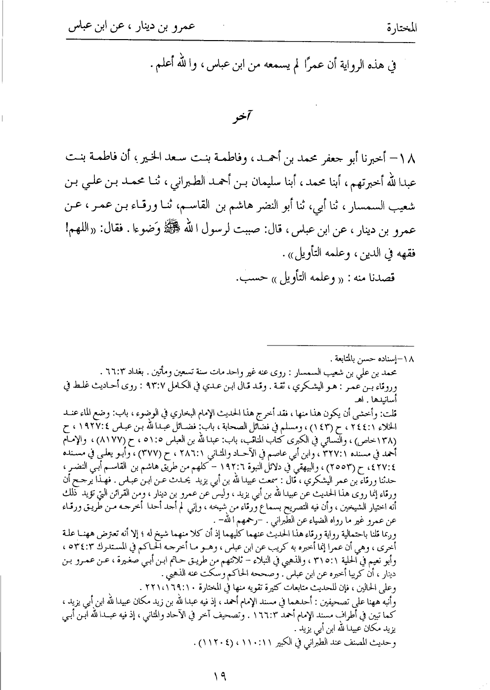 ١٨ - أَخْبَرَنَا أَبُو جَعْفَرٍ مُحَمَّدُ بْنُ أَحْمَدَ، وَفَاطِمَةُ بِنْتُ سَعْدِ الْخَيْرِ، أَنَّ فَاطِمَةَ بِنْتَ عَبْدِ اللهِ أَخْبَرَتْهُمْ، أَبْنَا مُحَمَّدٌ، أَبْنَا سُلَيْمَانُ بْنُ أَحْمَدَ الطَّبَرَانِيُّ، ثَنَا مُحَمَّدُ بْنُ عَلِيِّ بْنِ شُعَيْبٍ السِّمْسَارُ، ثَنَا أَبِي، ثَنَا أَبُو النَّضْرِ هَاشِمُ بْنُ الْقَاسِمِ، ثَنَا وَرْقَاءُ بْنُ عُمَرَ، عَنْ عَمْرِو بْنِ دِينَارٍ، عَنِ ابْنِ عَبَّاسٍ، قَالَ: «صَبَبْتُ لِرَسُولِ اللهِ صَلَّى اللهُ عَلَيْهِ وَسَلَّمَ وَضُوءًا، فَقَالَ: اللَّهُمَّ فَقِّهْهُ فِي الدِّينِ، وَعَلِّمْهُ التَّأْوِيلَ».