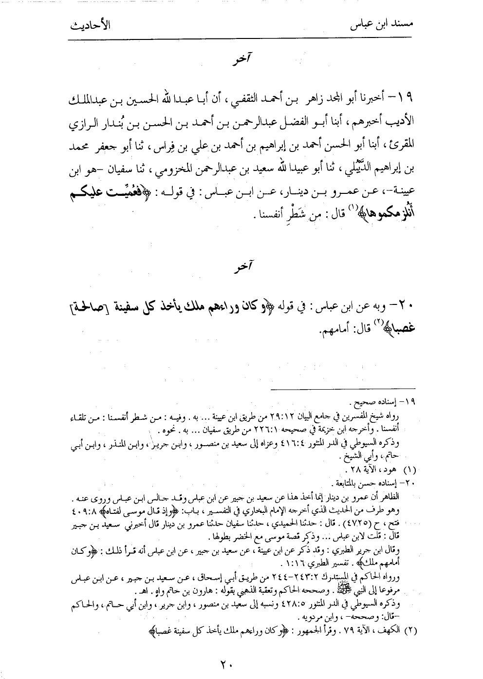 ١٩ - أَخْبَرَنَا أَبُو الْمَجْدِ زَاهِرُ بْنُ أَحْمَدَ الثَّقَفِيُّ، أَنَّ أَبَا عَبْدِ اللهِ الْحُسَيْنَ بْنَ عَبْدِ الْمَلِكِ الْأَدِيبَ أَخْبَرَهُمْ، أَبْنَا أَبُو الْفَضْلِ عَبْدُ الرَّحْمَنِ بْنُ أَحْمَدَ بْنِ الْحَسَنِ بْنِ بُنْدَارٍ الرَّازِيُّ الْمُقْرِئُ، أَبْنَا أَبُو الْحَسَنِ أَحْمَدُ بْنُ إِبْرَاهِيمَ بْنِ أَحْمَدَ بْنِ عَلِيِّ بْنِ فِرَاسٍ، ثَنَا أَبُو جَعْفَرٍ مُحَمَّدُ بْنُ إِبْرَاهِيمَ الدُّبَيْلِيُّ، ثَنَا أَبُو عُبَيْدِ اللهِ سَعِيدُ بْنُ عَبْدِ الرَّحْمَنِ الْمَخْزُومِيُّ، ثَنَا سُفْيَانُ - هُوَ ابْنُ عُيَيْنَةَ - عَنْ عَمْرِو بْنِ دِينَارٍ، عَنِ ابْنِ عَبَّاسٍ: «فِي قَوْلِهِ: {فَعُمِّيَتْ عَلَيْكُمْ أَنُلْزِمُكُمُوهَا} قَالَ: مِنْ شَطْرِ أَنْفُسِنَا».