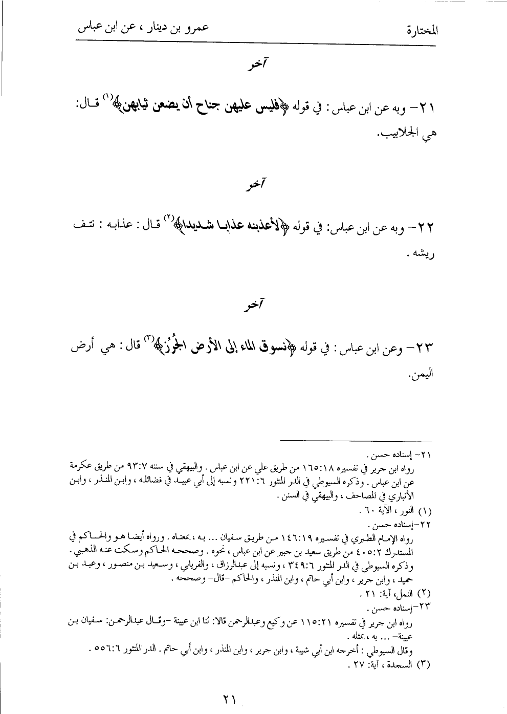 ٢١ - وَبِهِ عَنِ ابْنِ عَبَّاسٍ: «فِي قَوْلِهِ: {فَلَيْسَ عَلَيْهِنَّ جُنَاحٌ أَنْ يَضَعْنَ ثِيَابَهُنَّ} قَالَ: هِيَ الْجَلَابِيبُ».
