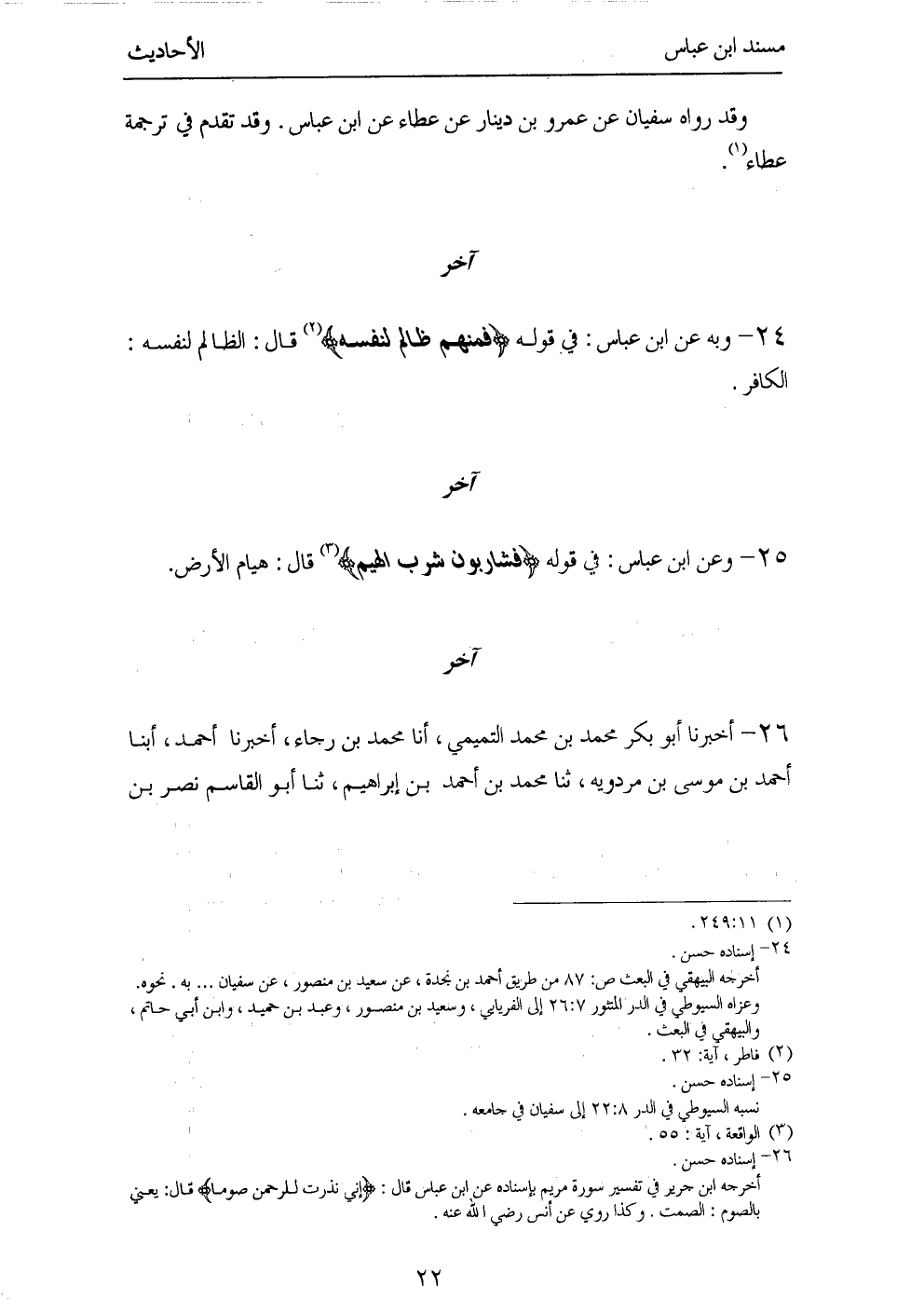 ٢٥ - وَعَنِ ابْنِ عَبَّاسٍ: «فِي قَوْلِهِ: {فَشَارِبُونَ شُرْبَ الْهِيمِ} قَالَ: هَيَامُ الْأَرْضِ».
