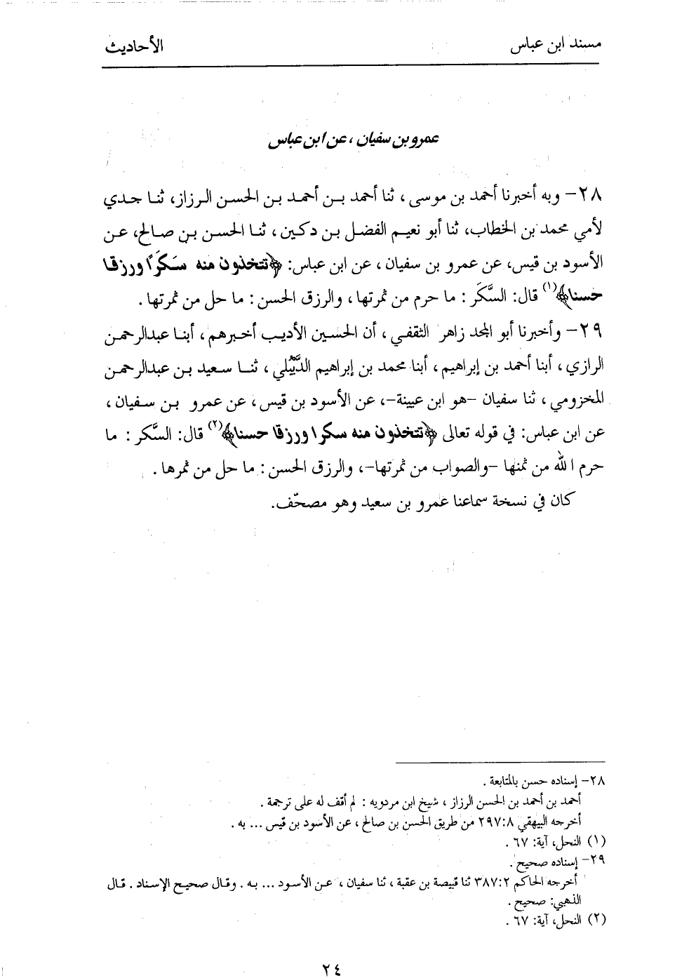 ٢٩ - وَأَخْبَرَنَا أَبُو الْمَجْدِ زَاهِرٌ الثَّقَفِيُّ، أَنَّ الْحُسَيْنَ الْأَدِيبَ أَخْبَرَهُمْ، أَبْنَا عَبْدُ الرَّحْمَنِ الرَّازِيُّ، أَبْنَا أَحْمَدُ بْنُ إِبْرَاهِيمَ، أَبْنَا مُحَمَّدُ بْنُ إِبْرَاهِيمَ الدُّبَيْلِيُّ، ثَنَا سَعِيدُ بْنُ عَبْدِ الرَّحْمَنِ الْمَخْزُومِيُّ، ثَنَا سُفْيَانُ - هُوَ ابْنُ عُيَيْنَةَ - عَنِ الْأَسْوَدِ بْنِ قَيْسٍ، عَنْ عَمْرِو بْنِ سُفْيَانَ، عَنِ ابْنِ عَبَّاسٍ: «فِي قَوْلِهِ تَعَالَى: {تَتَّخِذُونَ مِنْهُ سَكَرًا وَرِزْقًا حَسَنًا} قَالَ: السَّكَرُ: مَا حَرَّمَ اللهُ مِنْ ثَمَنِهَا - وَالصَّوَابُ: مِنْ ثَمَرَتِهَا - وَالرِّزْقُ الْحَسَنُ: مَا حَلَّ مِنْ ثَمَرِهَا».