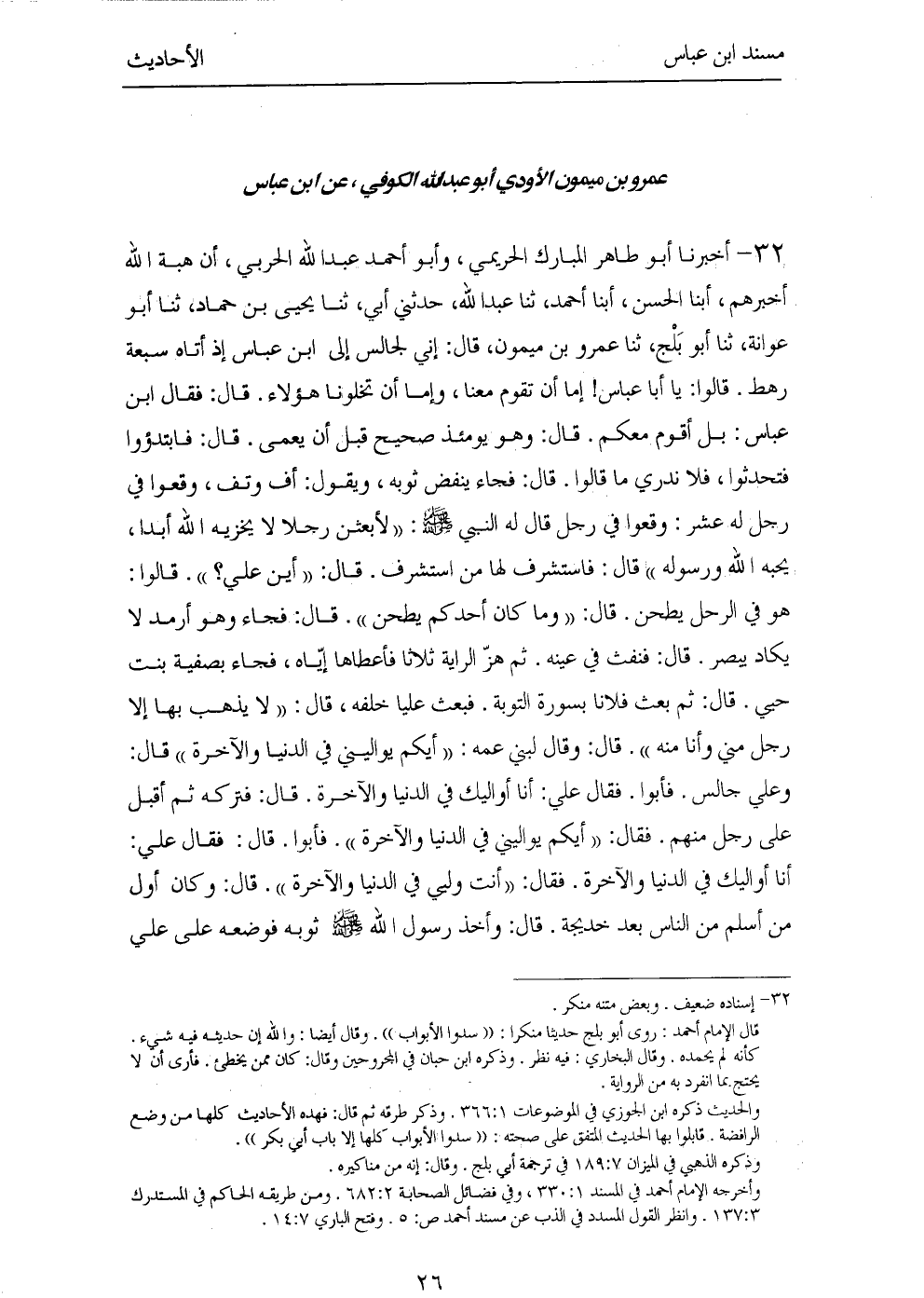 ٣٢ - أَخْبَرَنَا أَبُو طَاهِرٍ الْمُبَارَكُ الْحَرِيمِيُّ، وَأَبُو أَحْمَدَ عَبْدُ اللهِ الْحَرْبِيُّ، أَنَّ هِبَةَ اللهِ أَخْبَرَهُمْ، أَبْنَا الْحَسَنُ، أَبْنَا أَحْمَدُ، ثَنَا عَبْدُ اللهِ، حَدَّثَنِي أَبِي، ثَنَا يَحْيَى بْنُ حَمَّادٍ، ثَنَا أَبُو عَوَانَةَ، ثَنَا أَبُو بَلْجٍ، ثَنَا عَمْرُو بْنُ مَيْمُونٍ، قَالَ: «إِنِّي لَجَالِسٌ إِلَى ابْنِ عَبَّاسٍ إِذْ أَتَاهُ سَبْعَةُ رَهْطٍ. قَالُوا: يَا أَبَا عَبَّاسٍ! إِمَّا أَنْ تَقُومَ مَعَنَا، وَإِمَّا أَنْ تُخْلُونَا هَؤُلَاءِ. قَالَ: فَقَالَ ابْنُ عَبَّاسٍ: بَلْ أَقُومُ مَعَكُمْ. قَالَ: وَهُوَ يَوْمَئِذٍ صَحِيحٌ قَبْلَ أَنْ يَعْمَى. قَالَ: فَابْتَدَؤُوا فَتَحَدَّثُوا، فَلَا نَدْرِي مَا قَالُوا. قَالَ: فَجَاءَ يَنْفُضُ ثَوْبَهُ، وَيَقُولُ: أُفْ وَتُفْ، وَقَعُوا فِي رَجُلٍ لَهُ عَشْرٌ، وَقَعُوا فِي رَجُلٍ قَالَ لَهُ النَّبِيُّ صَلَّى اللهُ عَلَيْهِ وَسَلَّمَ: لَأَبْعَثَنَّ رَجُلًا لَا يُخْزِيهِ اللهُ أَبَدًا، يُحِبُّهُ اللهُ وَرَسُولُهُ، قَالَ: فَاسْتَشْرَفَ لَهَا مَنِ اسْتَشْرَفَ. قَالَ: أَيْنَ عَلِيٌّ؟ قَالُوا: هُوَ فِي الرَّحْلِ يَطْحَنُ. قَالَ: وَمَا كَانَ أَحَدُكُمْ يَطْحَنُ. قَالَ: فَجَاءَ وَهُوَ أَرْمَدُ لَا يَكَادُ يُبْصِرُ. قَالَ: فَنَفَثَ فِي عَيْنِهِ. ثُمَّ هَزَّ الرَّايَةَ ثَلَاثًا فَأَعْطَاهَا إِيَّاهُ، فَجَاءَ بِصَفِيَّةَ بِنْتِ حُيَيٍّ. قَالَ: ثُمَّ بَعَثَ فُلَانًا بِسُورَةِ التَّوْبَةِ. فَبَعَثَ عَلِيًّا خَلْفَهُ، قَالَ: لَا يَذْهَبُ بِهَا إِلَّا رَجُلٌ مِنِّي وَأَنَا مِنْهُ. قَالَ: وَقَالَ لِبَنِي عَمِّهِ: أَيُّكُمْ يُوَالِينِي فِي الدُّنْيَا وَالْآخِرَةِ قَالَ: وَعَلِيٌّ جَالِسٌ، فَأَبَوْا، فَقَالَ عَلِيٌّ: أَنَا أُوَالِيكَ فِي الدُّنْيَا وَالْآخِرَةِ. قَالَ: فَتَرَكَهُ ثُمَّ أَقْبَلَ عَلَى رَجُلٍ مِنْهُمْ. فَقَالَ: أَيُّكُمْ يُوَالِينِي فِي الدُّنْيَا وَالْآخِرَةِ فَأَبَوْا، قَالَ: فَقَالَ عَلِيٌّ: أَنَا أُوَالِيكَ فِي الدُّنْيَا وَالْآخِرَةِ. فَقَالَ: أَنْتَ وَلِيِّي فِي الدُّنْيَا وَالْآخِرَةِ. قَالَ: وَكَانَ أَوَّلَ مَنْ أَسْلَمَ مِنَ النَّاسِ بَعْدَ خَدِيجَةَ، قَالَ: وَأَخَذَ رَسُولُ اللهِ صَلَّى اللهُ عَلَيْهِ وَسَلَّمَ ثَوْبَهُ فَوَضَعَهُ عَلَى عَلِيٍّ