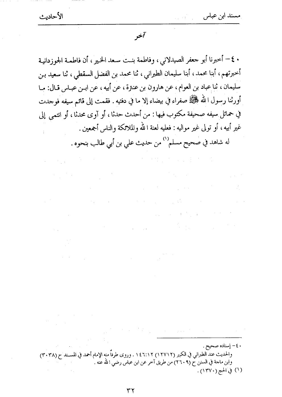 ٤٠ - أَخْبَرَنَا أَبُو جَعْفَرٍ الصَّيْدَلَانِيُّ، وَفَاطِمَةُ بِنْتُ سَعْدِ الْخَيْرِ، أَنَّ فَاطِمَةَ الْجُوزْدَانِيَّةَ أَخْبَرَتْهُمْ، أَبْنَا مُحَمَّدٌ، أَبْنَا سُلَيْمَانُ الطَّبَرَانِيُّ، ثَنَا مُحَمَّدُ بْنُ الْفَضْلِ السَّقَطِيُّ، ثَنَا سَعِيدُ بْنُ سُلَيْمَانَ، ثَنَا عَبَّادُ بْنُ الْعَوَّامِ، عَنْ هَارُونَ بْنِ عَنْتَرَةَ، عَنْ أَبِيهِ، عَنِ ابْنِ عَبَّاسٍ قَالَ: «مَا أَوْرَثَنَا رَسُولُ اللهِ صَلَّى اللهُ عَلَيْهِ وَسَلَّمَ صَفْرَاءَ فِي بَيْضَاءَ إِلَّا مَا فِي دَفَّتَيْهِ. فَقُمْتُ إِلَى قَائِمِ سَيْفِهِ فَوَجَدْتُ فِي حَمَائِلِ سَيْفِهِ صَحِيفَةً مَكْتُوبًا فِيهَا: مَنْ أَحْدَثَ حَدَثًا، أَوْ آوَى مُحْدِثًا، أَوِ انْتَمَى إِلَى غَيْرِ أَبِيهِ، أَوْ تَوَلَّى غَيْرَ مَوَالِيهِ: فَعَلَيْهِ لَعْنَةُ اللهِ وَالْمَلَائِكَةِ وَالنَّاسِ أَجْمَعِينَ».