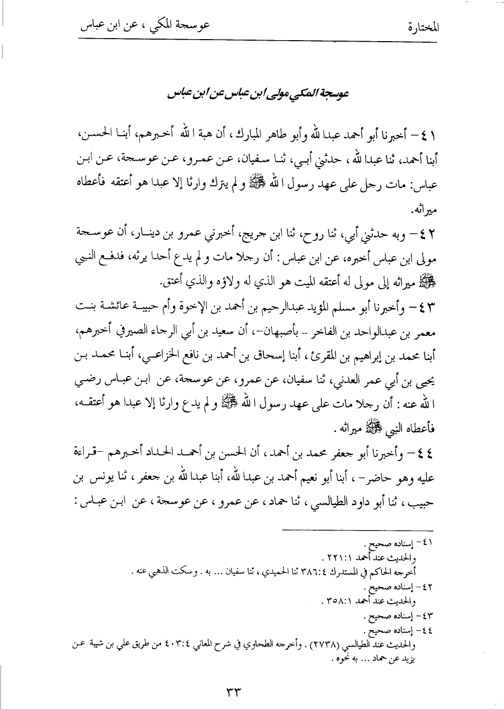 ٤١ - أَخْبَرَنَا أَبُو أَحْمَدَ عَبْدُ اللهِ (¬١) وَأَبُو طَاهِرٍ الْمُبَارَكُ، أَنَّ هِبَةَ اللهِ أَخْبَرَهُمْ، أَبْنَا الْحَسَنُ، أَبْنَا أَحْمَدُ، ثَنَا عَبْدُ اللهِ، حَدَّثَنِي أَبِي، ثَنَا سُفْيَانُ، عَنْ عَمْرٍو، عَنْ عَوْسَجَةَ، عَنِ ابْنِ عَبَّاسٍ: «مَاتَ رَجُلٌ عَلَى عَهْدِ رَسُولِ اللهِ صَلَّى اللهُ عَلَيْهِ وَسَلَّمَ وَلَمْ يَتْرُكْ وَارِثًا إِلَّا عَبْدًا هُوَ أَعْتَقَهُ فَأَعْطَاهُ مِيرَاثَهُ».