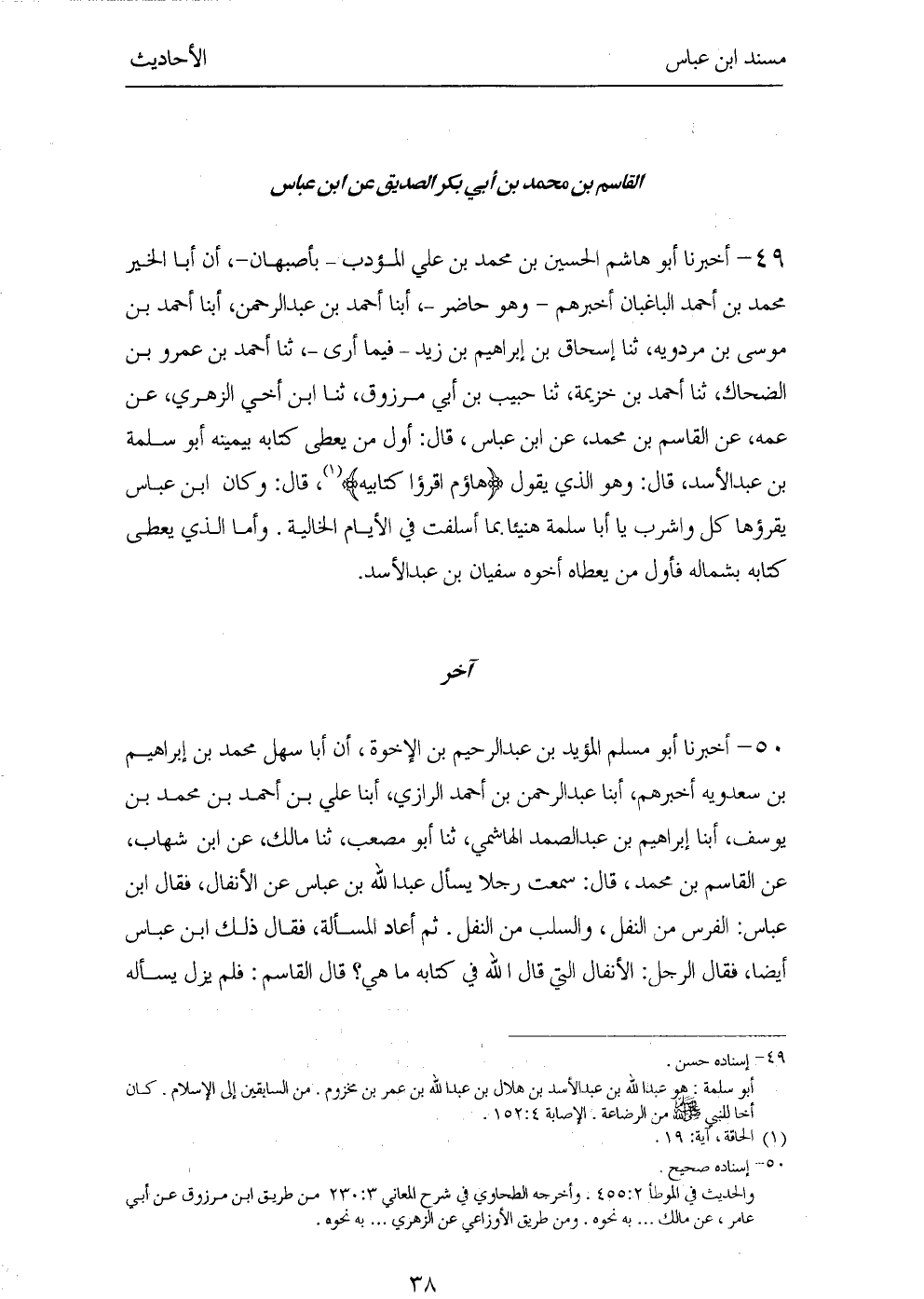 ٤٩ - أَخْبَرَنَا أَبُو هَاشِمٍ الْحُسَيْنُ بْنُ مُحَمَّدِ بْنِ عَلِيٍّ الْمُؤَدِّبُ - بِأَصْبَهَانَ - أَنَّ أَبَا الْخَيْرِ مُحَمَّدَ بْنَ أَحْمَدَ الْبَاغِبَانَ أَخْبَرَهُمْ - وَهُوَ حَاضِرٌ - أَبْنَا أَحْمَدُ بْنُ عَبْدِ الرَّحْمَنِ، أَبْنَا أَحْمَدُ بْنُ مُوسَى بْنِ مَرْدُوَيْهِ، ثَنَا إِسْحَاقُ بْنُ إِبْرَاهِيمَ بْنِ زَيْدٍ - فِيمَا أَرَى - ثَنَا أَحْمَدُ بْنُ عَمْرِو بْنِ الضَّحَّاكِ، ثَنَا أَحْمَدُ بْنُ خُزَيْمَةَ، ثَنَا حَبِيبُ بْنُ أَبِي مَرْزُوقٍ، ثَنَا ابْنُ أَخِي الزُّهْرِيِّ، عَنْ عَمِّهِ، عَنِ الْقَاسِمِ بْنِ مُحَمَّدٍ، عَنِ ابْنِ عَبَّاسٍ، قَالَ: «أَوَّلُ مَنْ يُعْطَى كِتَابَهُ بِيَمِينِهِ أَبُو سَلَمَةَ بْنُ عَبْدِ الْأَسَدِ، قَالَ: وَهُوَ الَّذِي يَقُولُ: {هَاؤُمُ اقْرَءُوا كِتَابِيَهْ}، قَالَ: وَكَانَ ابْنُ عَبَّاسٍ يَقْرَؤُهَا: كُلْ وَاشْرَبْ يَا أَبَا سَلَمَةَ هَنِيئًا بِمَا أَسْلَفْتَ فِي الْأَيَّامِ الْخَالِيَةِ. وَأَمَّا الَّذِي يُعْطَى كِتَابَهُ بِشِمَالِهِ فَأَوَّلُ مَنْ يُعْطَاهُ أَخُوهُ سُفْيَانُ بْنُ عَبْدِ الْأَسَدِ».