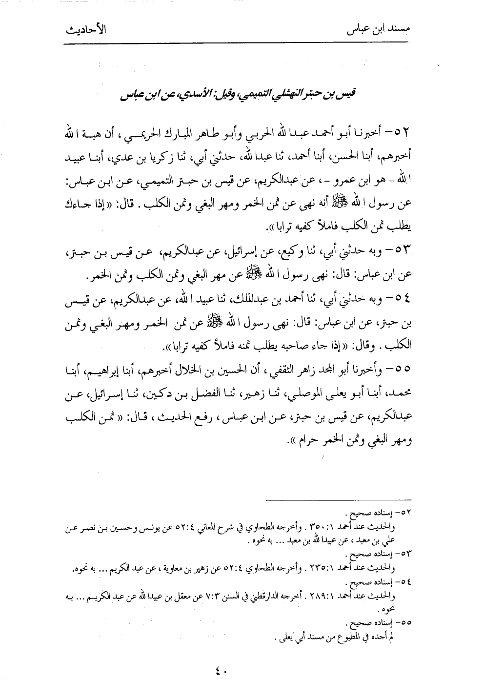 ٥٢ - أَخْبَرَنَا أَبُو أَحْمَدَ عَبْدُ اللهِ الْحَرْبِيُّ (¬١) وَأَبُو طَاهِرٍ الْمُبَارَكُ الْحَرِيمِيُّ، أَنَّ هِبَةَ اللهِ أَخْبَرَهُمْ، أَبْنَا الْحَسَنُ، أَبْنَا أَحْمَدُ، ثَنَا عَبْدُ اللهِ، حَدَّثَنِي أَبِي، ثَنَا زَكَرِيَّا بْنُ عَدِيٍّ، أَبْنَا عُبَيْدُ اللهِ - هُوَ ابْنُ عَمْرٍو - عَنْ عَبْدِ الْكَرِيمِ، عَنْ قَيْسِ بْنِ حَبْتَرٍ التَّمِيمِيِّ، عَنِ ابْنِ عَبَّاسٍ: عَنْ رَسُولِ اللهِ صَلَّى اللهُ عَلَيْهِ وَسَلَّمَ أَنَّهُ «نَهَى عَنْ ثَمَنِ الْخَمْرِ، وَمَهْرِ الْبَغِيِّ، وَثَمَنِ الْكَلْبِ. قَالَ: إِذَا جَاءَكَ يَطْلُبُ ثَمَنَ الْكَلْبِ فَامْلَأْ كَفَّيْهِ تُرَابًا».