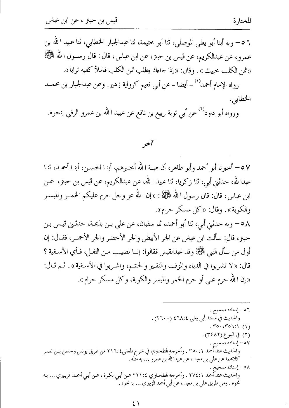 ٥٦ - وَبِهِ أَبْنَا أَبُو يَعْلَى الْمَوْصِلِيُّ، ثَنَا أَبُو خَيْثَمَةَ، ثَنَا عَبْدُ الْجَبَّارِ الْخَطَّابِيُّ، ثَنَا عُبَيْدُ اللهِ بْنُ عَمْرٍو، عَنْ عَبْدِ الْكَرِيمِ، عَنْ قَيْسِ بْنِ حَبْتَرٍ، عَنِ ابْنِ عَبَّاسٍ: قَالَ: قَالَ رَسُولُ اللهِ صَلَّى اللهُ عَلَيْهِ وَسَلَّمَ: «ثَمَنُ الْكَلْبِ خَبِيثٌ. وَقَالَ: إِذَا جَاءَكَ يَطْلُبُ ثَمَنَ الْكَلْبِ فَامْلَأْ كَفَّيْهِ تُرَابًا».
