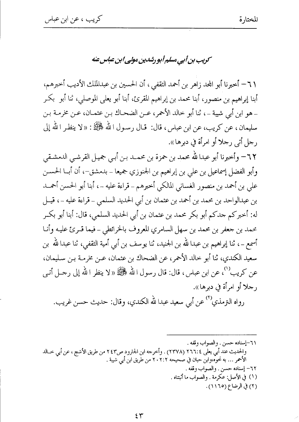 ٦١ - أَخْبَرَنَا أَبُو الْمَجْدِ زَاهِرُ بْنُ أَحْمَدَ الثَّقَفِيُّ، أَنَّ الْحُسَيْنَ بْنَ عَبْدِ الْمَلِكِ الْأَدِيبَ أَخْبَرَهُمْ، أَبْنَا إِبْرَاهِيمُ بْنُ مَنْصُورٍ، أَبْنَا مُحَمَّدُ بْنُ إِبْرَاهِيمَ الْمُقْرِئُ، أَبْنَا أَبُو يَعْلَى الْمَوْصِلِيُّ، ثَنَا أَبُو بَكْرٍ - هُوَ ابْنُ أَبِي شَيْبَةَ - ثَنَا أَبُو خَالِدٍ الْأَحْمَرُ، عَنِ الضَّحَّاكِ بْنِ عُثْمَانَ، عَنْ مَخْرَمَةَ بْنِ سُلَيْمَانَ، عَنْ كُرَيْبٍ، عَنِ ابْنِ عَبَّاسٍ، قَالَ: قَالَ رَسُولُ اللهِ صَلَّى اللهُ عَلَيْهِ وَسَلَّمَ: «لَا يَنْظُرُ اللهُ إِلَى رَجُلٍ أَتَى رَجُلًا أَوِ امْرَأَةً فِي دُبُرِهَا».