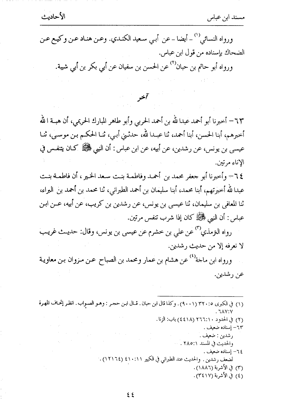 ٦٤ - وَأَخْبَرَنَا أَبُو جَعْفَرٍ مُحَمَّدُ بْنُ أَحْمَدَ وَفَاطِمَةُ بِنْتُ سَعْدِ الْخَيْرِ، أَنَّ فَاطِمَةَ بِنْتَ عَبْدِ اللهِ أَخْبَرَتْهُمْ، أَبْنَا مُحَمَّدٌ، أَبْنَا سُلَيْمَانُ بْنُ أَحْمَدَ الطَّبَرَانِيُّ، ثَنَا مُحَمَّدُ بْنُ أَحْمَدَ بْنِ الْبَرَاءِ، ثَنَا الْمُعَافَى بْنُ سُلَيْمَانَ، ثَنَا عِيسَى بْنُ يُونُسَ، عَنْ رِشْدِينَ بْنِ كُرَيْبٍ، عَنْ أَبِيهِ، عَنِ ابْنِ عَبَّاسٍ، أَنَّ النَّبِيَّ صَلَّى اللهُ عَلَيْهِ وَسَلَّمَ «كَانَ إِذَا شَرِبَ تَنَفَّسَ مَرَّتَيْنِ».