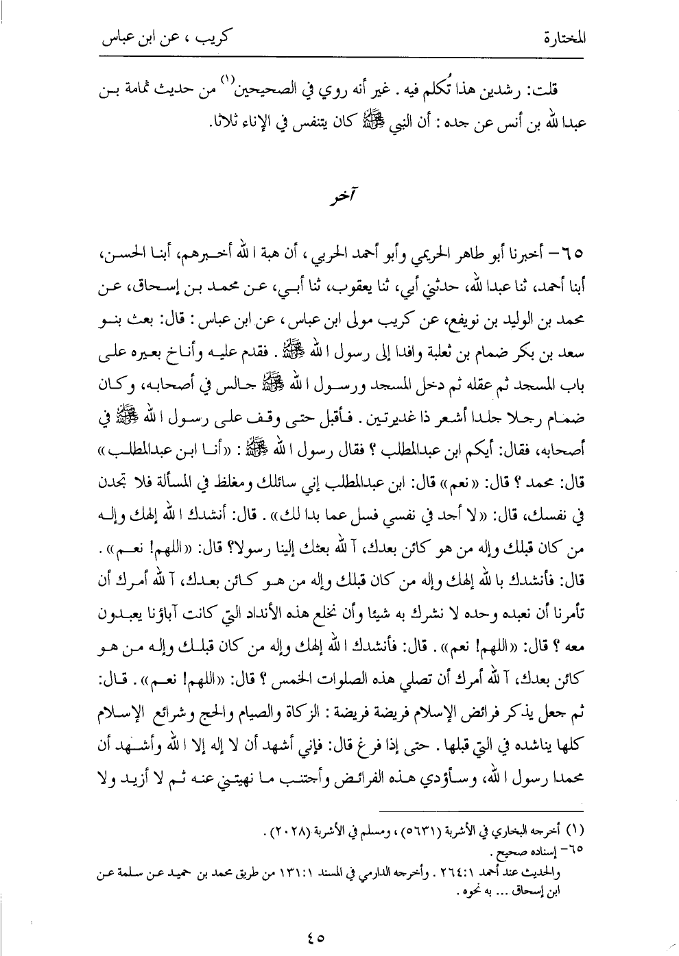 ٦٥ - أَخْبَرَنَا أَبُو طَاهِرٍ الْحَرِيمِيُّ وَأَبُو أَحْمَدَ (¬١) الْحَرْبِيُّ، أَنَّ هِبَةَ اللهِ أَخْبَرَهُمْ، أَبْنَا الْحَسَنُ، أَبْنَا أَحْمَدُ، ثَنَا عَبْدُ اللهِ، حَدَّثَنِي أَبِي، ثَنَا يَعْقُوبُ، ثَنَا أَبِي، عَنْ مُحَمَّدِ بْنِ إِسْحَاقَ، عَنْ مُحَمَّدِ بْنِ الْوَلِيدِ بْنِ نُوَيْفِعٍ، عَنْ كُرَيْبٍ مَوْلَى ابْنِ عَبَّاسٍ، عَنِ ابْنِ عَبَّاسٍ قَالَ: «بَعَثَ بَنُو سَعْدِ بْنِ بَكْرٍ ضِمَامَ بْنَ ثَعْلَبَةَ وَافِدًا إِلَى رَسُولِ اللهِ صَلَّى اللهُ عَلَيْهِ وَسَلَّمَ. فَقَدِمَ عَلَيْهِ وَأَنَاخَ بَعِيرَهُ عَلَى بَابِ الْمَسْجِدِ ثُمَّ عَقَلَهُ، ثُمَّ دَخَلَ الْمَسْجِدَ وَرَسُولُ اللهِ صَلَّى اللهُ عَلَيْهِ وَسَلَّمَ جَالِسٌ فِي أَصْحَابِهِ، وَكَانَ ضِمَامٌ رَجُلًا جَلْدًا أَشْعَرَ ذَا غَدِيرَتَيْنِ. فَأَقْبَلَ حَتَّى وَقَفَ عَلَى رَسُولِ اللهِ صَلَّى اللهُ عَلَيْهِ وَسَلَّمَ فِي أَصْحَابِهِ، فَقَالَ: أَيُّكُمُ ابْنُ عَبْدِ الْمُطَّلِبِ؟ فَقَالَ رَسُولُ اللهِ صَلَّى اللهُ عَلَيْهِ وَسَلَّمَ: أَنَا ابْنُ عَبْدِ الْمُطَّلِبِ قَالَ: مُحَمَّدٌ؟ قَالَ: نَعَمْ قَالَ: ابْنَ عَبْدِ الْمُطَّلِبِ إِنِّي سَائِلُكَ وَمُغَلِّظٌ فِي الْمَسْأَلَةِ فَلَا تَجِدَنَّ فِي نَفْسِكَ، قَالَ: لَا أَجِدُ فِي نَفْسِي فَسَلْ عَمَّا بَدَا لَكَ. قَالَ: أَنْشُدُكَ اللهَ إِلَهَكَ وَإِلَهَ مَنْ كَانَ قَبْلَكَ وَإِلَهَ مَنْ هُوَ كَائِنٌ بَعْدَكَ، آللهُ بَعَثَكَ إِلَيْنَا رَسُولًا؟ قَالَ: اللَّهُمَّ نَعَمْ. قَالَ: فَأَنْشُدُكَ بِاللهِ إِلَهِكَ وَإِلَهِ مَنْ كَانَ قَبْلَكَ وَإِلَهِ مَنْ هُوَ كَائِنٌ بَعْدَكَ، آللهُ أَمَرَكَ أَنْ تَأْمُرَنَا أَنْ نَعْبُدَهُ وَحْدَهُ لَا نُشْرِكُ بِهِ شَيْئًا وَأَنْ نَخْلَعَ هَذِهِ الْأَنْدَادَ الَّتِي كَانَتْ آبَاؤُنَا يَعْبُدُونَ مَعَهُ؟ قَالَ: اللَّهُمَّ نَعَمْ. قَالَ: فَأَنْشُدُكَ اللهَ إِلَهَكَ وَإِلَهَ مَنْ كَانَ قَبْلَكَ وَإِلَهَ مَنْ هُوَ كَائِنٌ بَعْدَكَ، آللهُ أَمَرَكَ أَنْ تُصَلِّيَ هَذِهِ الصَّلَوَاتِ الْخَمْسَ؟ قَالَ: اللَّهُمَّ نَعَمْ. قَالَ: ثُمَّ جَعَلَ يَذْكُرُ فَرَائِضَ الْإِسْلَامِ؛ فَرِيضَةً فَرِيضَةً، الزَّكَاةَ وَالصِّيَامَ وَالْحَجَّ وَشَرَائِعَ الْإِسْلَامِ كُلَّهَا، يُنَاشِدُهُ فِي الَّتِي قَبْلَهَا. حَتَّى إِذَا فَرَغَ قَالَ: فَإِنِّي أَشْهَدُ أَنْ لَا إِلَهَ إِلَّا اللهُ وَأَشْهَدُ أَنَّ مُحَمَّدًا رَسُولُ اللهِ، وَسَأُؤَدِّي هَذِهِ الْفَرَائِضَ وَأَجْتَنِبُ مَا نَهَيْتَنِي عَنْهُ ثُمَّ لَا أَزِيدُ وَلَا