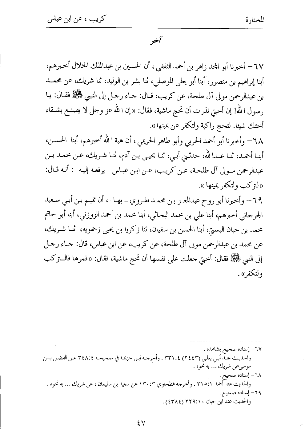 ٦٧ - أَخْبَرَنَا أَبُو الْمَجْدِ زَاهِرُ بْنُ أَحْمَدَ الثَّقَفِيُّ، أَنَّ الْحُسَيْنَ بْنَ عَبْدِ الْمَلِكِ الْخَلَّالَ أَخْبَرَهُمْ، أَبْنَا إِبْرَاهِيمُ بْنُ مَنْصُورٍ (¬١)، أَبْنَا أَبُو يَعْلَى الْمَوْصِلِيُّ، ثَنَا بِشْرُ بْنُ الْوَلِيدِ، ثَنَا شَرِيكٌ، عَنْ مُحَمَّدِ بْنِ عَبْدِ الرَّحْمَنِ، مَوْلَى آلِ طَلْحَةَ، عَنْ كُرَيْبٍ، قَالَ: «جَاءَ رَجُلٌ إِلَى النَّبِيِّ صَلَّى اللهُ عَلَيْهِ وَسَلَّمَ فَقَالَ: يَا رَسُولَ اللهِ! إِنَّ أُخْتِي نَذَرَتْ أَنْ تَحُجَّ مَاشِيَةً، فَقَالَ: إِنَّ اللهَ عَزَّ وَجَلَّ لَا يَصْنَعُ بِشَقَاءِ أُخْتِكَ شَيْئًا. لِتَحُجَّ رَاكِبَةً وَلْتُكَفِّرْ عَنْ يَمِينِهَا».
