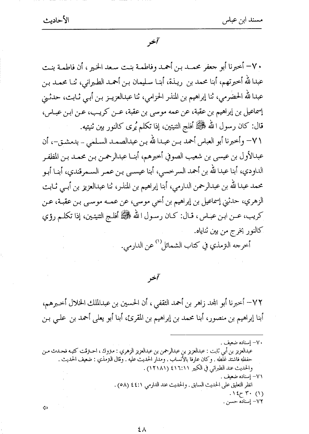 ٧١ - وَأَخْبَرَنَا أَبُو الْعَبَّاسِ أَحْمَدُ بْنُ عَبْدِ اللهِ بْنِ عَبْدِ الصَّمَدِ السُّلَمِيُّ - بِدِمَشْقَ - أَنَّ عَبْدَ الْأَوَّلِ بْنَ عِيسَى بْنِ شُعَيْبٍ الصُّوفِيَّ أَخْبَرَهُمْ، أَبْنَا عَبْدُ الرَّحْمَنِ بْنُ مُحَمَّدِ بْنِ الْمُظَفَّرِ الدَّاوُدِيُّ، أَبْنَا عَبْدُ اللهِ بْنُ أَحْمَدَ السَّرَخْسِيُّ، أَبْنَا عِيسَى بْنُ عُمَرَ السَّمَرْقَنْدِيُّ، أَبْنَا أَبُو مُحَمَّدٍ عَبْدُ اللهِ بْنُ عَبْدِ الرَّحْمَنِ الدَّارِمِيُّ، أَبْنَا إِبْرَاهِيمُ بْنُ الْمُنْذِرِ، ثَنَا عَبْدُ الْعَزِيزِ بْنُ أَبِي ثَابِتٍ الزُّهْرِيُّ، حَدَّثَنِي إِسْمَاعِيلُ بْنُ إِبْرَاهِيمَ ابْنِ أَخِي مُوسَى، عَنْ عَمِّهِ مُوسَى بْنِ عُقْبَةَ، عَنْ كُرَيْبٍ، عَنِ ابْنِ عَبَّاسٍ، قَالَ: «كَانَ رَسُولُ اللهِ صَلَّى اللهُ عَلَيْهِ وَسَلَّمَ أَفْلَجَ الثَّنِيَّتَيْنِ، إِذَا تَكَلَّمَ رُؤِيَ كَالنُّورِ يَخْرُجُ مِنْ بَيْنِ ثَنَايَاهُ».