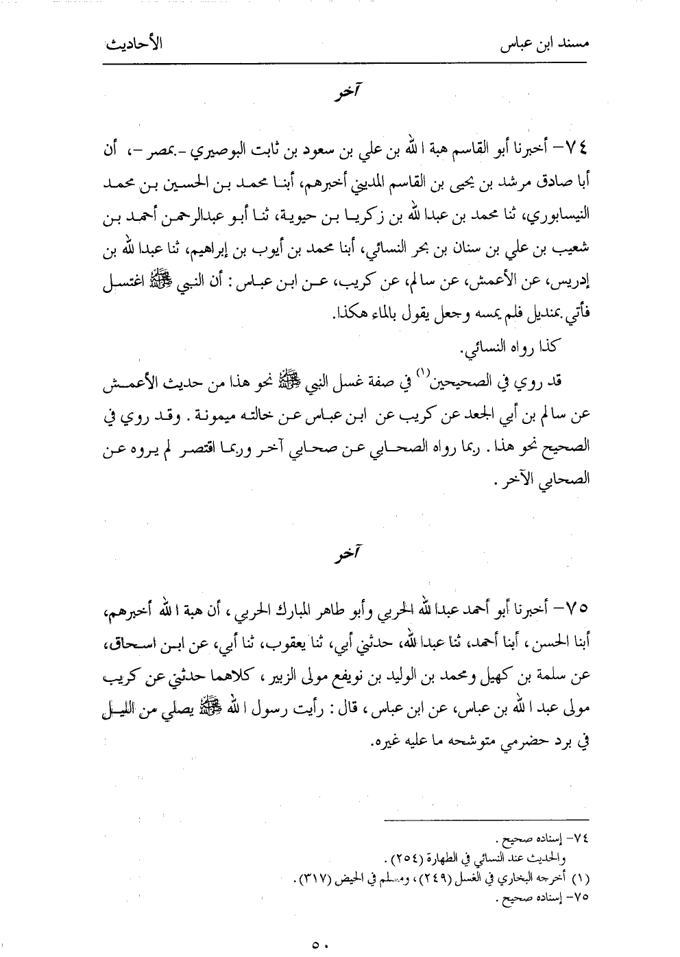 ٧٤ - أَخْبَرَنَا أَبُو الْقَاسِمِ هِبَةُ اللهِ بْنُ عَلِيِّ بْنِ سُعُودِ بْنِ ثَابِتٍ الْبُوصِيرِيُّ - بِمِصْرَ - أَنَّ أَبَا صَادِقٍ مُرْشِدَ بْنَ يَحْيَى بْنِ الْقَاسِمِ الْمَدِينِيَّ أَخْبَرَهُمْ، أَبْنَا مُحَمَّدُ بْنُ الْحُسَيْنِ بْنِ مُحَمَّدٍ النَّيْسَابُورِيُّ، ثَنَا مُحَمَّدُ بْنُ عَبْدِ اللهِ بْنِ زَكَرِيَّا بْنِ حَيُّوَيْهِ، ثَنَا أَبُو عَبْدِ الرَّحْمَنِ أَحْمَدُ بْنُ شُعَيْبِ بْنِ عَلِيِّ بْنِ سِنَانِ بْنِ بَحْرٍ النَّسَائِيُّ، أَبْنَا مُحَمَّدُ بْنُ أَيُّوبَ بْنِ إِبْرَاهِيمَ، ثَنَا عَبْدُ اللهِ بْنُ إِدْرِيسَ، عَنِ الْأَعْمَشِ، عَنْ سَالِمٍ، عَنْ كُرَيْبٍ، عَنِ ابْنِ عَبَّاسٍ، «أَنَّ النَّبِيَّ صَلَّى اللهُ عَلَيْهِ وَسَلَّمَ اغْتَسَلَ فَأُتِيَ بِمِنْدِيلٍ فَلَمْ يَمَسَّهُ وَجَعَلَ يَقُولُ بِالْمَاءِ هَكَذَا».