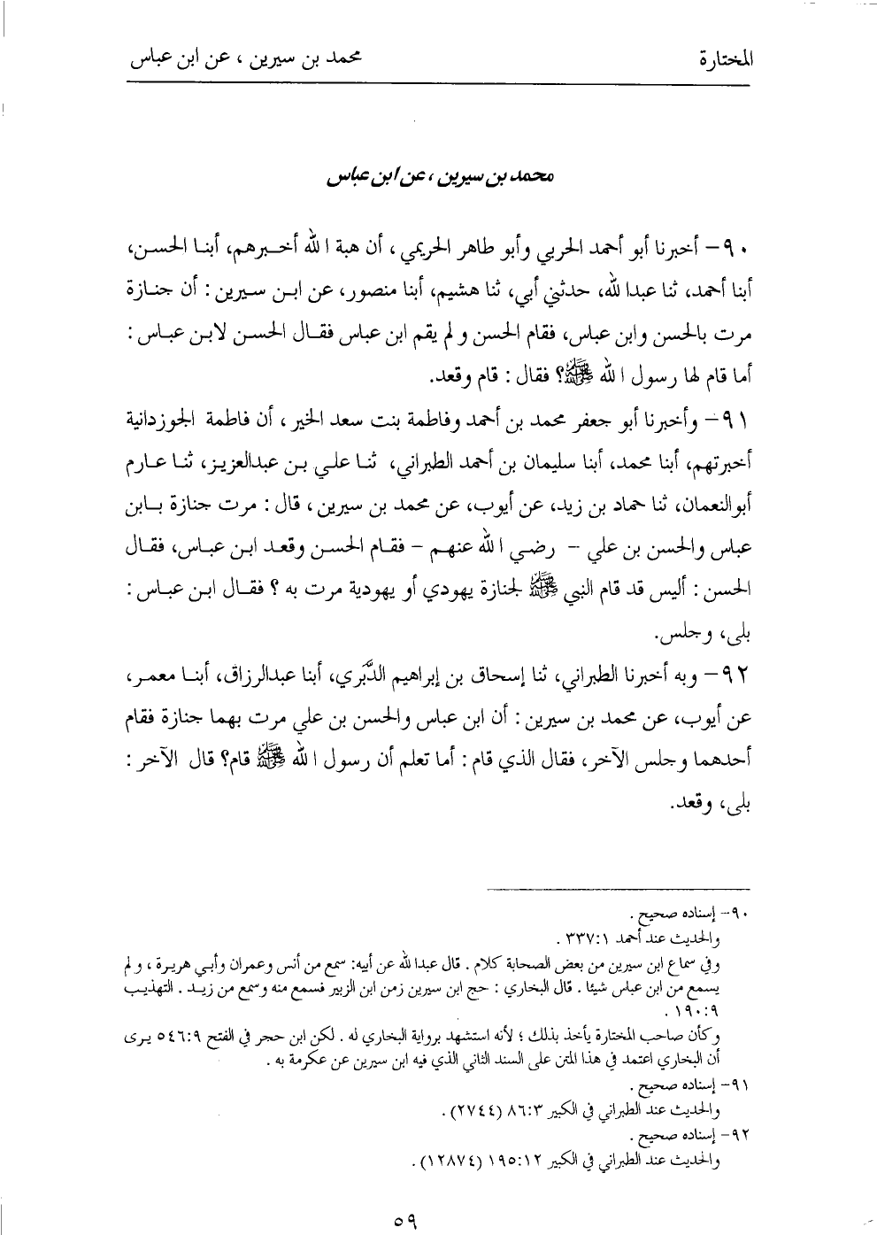٩١ - وَأَخْبَرَنَا أَبُو جَعْفَرٍ مُحَمَّدُ بْنُ أَحْمَدَ وَفَاطِمَةُ بِنْتُ سَعْدِ الْخَيْرِ، أَنَّ فَاطِمَةَ الْجُوزْدَانِيَّةَ أَخْبَرَتْهُمْ، أَبْنَا مُحَمَّدٌ، أَبْنَا سُلَيْمَانُ بْنُ أَحْمَدَ الطَّبَرَانِيُّ، ثَنَا عَلِيُّ بْنُ عَبْدِ الْعَزِيزِ، ثَنَا عَارِمٌ أَبُو النُّعْمَانِ، ثَنَا حَمَّادُ بْنُ زَيْدٍ، عَنْ أَيُّوبَ، عَنْ مُحَمَّدِ بْنِ سِيرِينَ، قَالَ: «مَرَّتْ جِنَازَةٌ بِابْنِ عَبَّاسٍ وَالْحَسَنِ بْنِ عَلِيٍّ - رَضِيَ اللهُ عَنْهُمْ - فَقَامَ الْحَسَنُ وَقَعَدَ ابْنُ عَبَّاسٍ، فَقَالَ الْحَسَنُ: أَلَيْسَ قَدْ قَامَ النَّبِيُّ صَلَّى اللهُ عَلَيْهِ وَسَلَّمَ لِجِنَازَةِ يَهُودِيٍّ أَوْ يَهُودِيَّةٍ مَرَّتْ بِهِ؟ فَقَالَ ابْنُ عَبَّاسٍ: بَلَى، وَجَلَسَ».