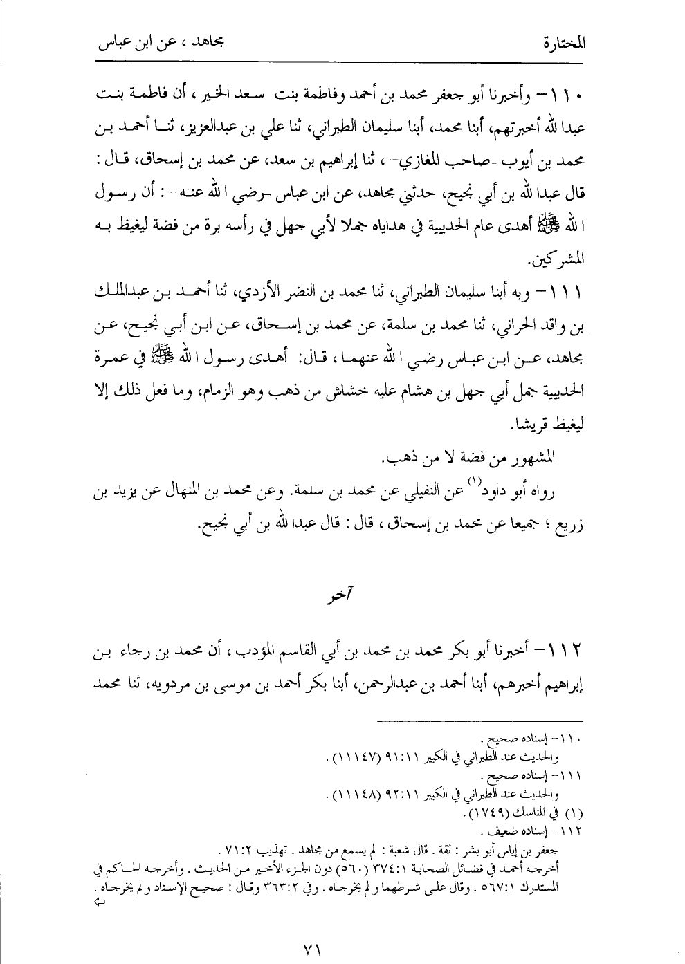 ١١٠ - وَأَخْبَرَنَا أَبُو جَعْفَرٍ مُحَمَّدُ بْنُ أَحْمَدَ، وَفَاطِمَةُ بِنْتُ سَعْدِ الْخَيْرِ، أَنَّ فَاطِمَةَ بِنْتَ عَبْدِ اللهِ أَخْبَرَتْهُمْ، أَبْنَا مُحَمَّدٌ، أَبْنَا سُلَيْمَانُ الطَّبَرَانِيُّ، ثَنَا عَلِيُّ بْنُ عَبْدِ الْعَزِيزِ، ثَنَا أَحْمَدُ بْنُ مُحَمَّدِ بْنِ أَيُّوبَ - صَاحِبُ الْمَغَازِي - ثَنَا إِبْرَاهِيمُ بْنُ سَعْدٍ، عَنْ مُحَمَّدِ بْنِ إِسْحَاقَ، قَالَ: قَالَ عَبْدُ اللهِ بْنُ أَبِي نَجِيحٍ: حَدَّثَنِي مُجَاهِدٌ، عَنِ ابْنِ عَبَّاسٍ - رَضِيَ اللهُ عَنْهُ - «أَنَّ رَسُولَ اللهِ صَلَّى اللهُ عَلَيْهِ وَسَلَّمَ أَهْدَى عَامَ الْحُدَيْبِيَةِ فِي هَدَايَاهُ جَمَلًا لِأَبِي جَهْلٍ فِي رَأْسِهِ بُرَةٌ مِنْ فِضَّةٍ؛ لِيَغِيظَ بِهِ الْمُشْرِكِينَ».