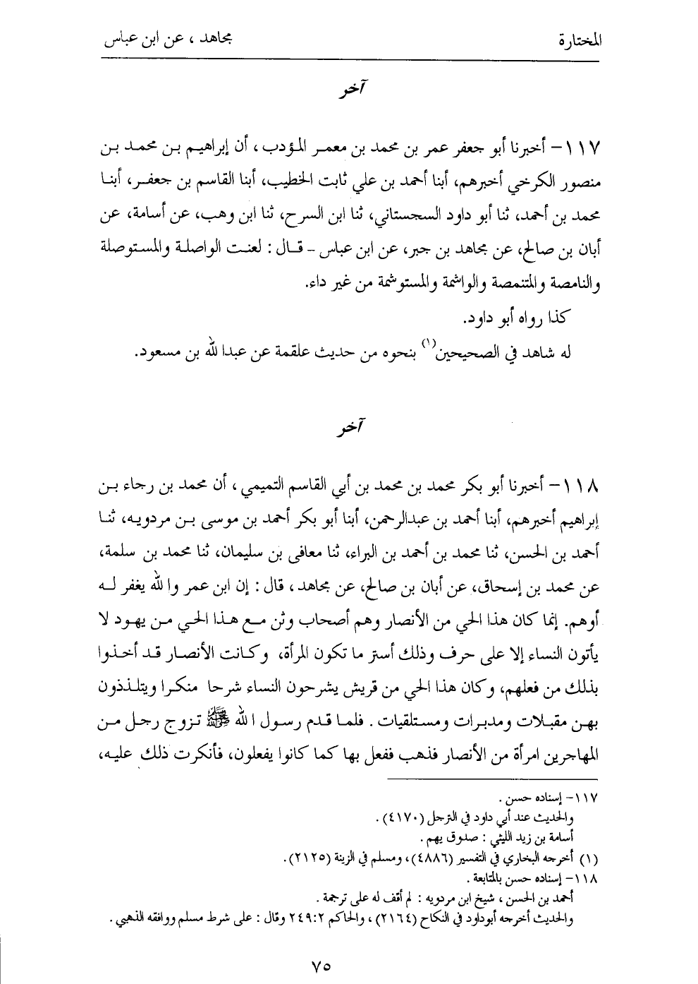 ١١٧ - أَخْبَرَنَا أَبُو جَعْفَرٍ عُمَرُ بْنُ مُحَمَّدِ بْنِ مَعْمَرٍ الْمُؤَدِّبُ، أَنَّ إِبْرَاهِيمَ بْنَ مُحَمَّدِ بْنِ مَنْصُورٍ الْكَرْخِيَّ أَخْبَرَهُمْ، أَبْنَا أَحْمَدُ بْنُ عَلِيٍّ ثَابِتٌ الْخَطِيبُ، أَبْنَا الْقَاسِمُ بْنُ جَعْفَرٍ، أَبْنَا مُحَمَّدُ بْنُ أَحْمَدَ، ثَنَا أَبُو دَاوُدَ السِّجِسْتَانِيُّ، ثَنَا ابْنُ السَّرْحِ، ثَنَا ابْنُ وَهْبٍ، عَنْ أُسَامَةَ، عَنْ أَبَانَ بْنِ صَالِحٍ، عَنْ مُجَاهِدِ بْنِ جَبْرٍ، عَنِ ابْنِ عَبَّاسٍ، قَالَ: «لُعِنَتِ الْوَاصِلَةُ وَالْمُسْتَوْصِلَةُ وَالنَّامِصَةُ وَالْمُتَنَمِّصَةُ وَالْوَاشِمَةُ وَالْمُسْتَوْشِمَةُ مِنْ غَيْرِ دَاءٍ».