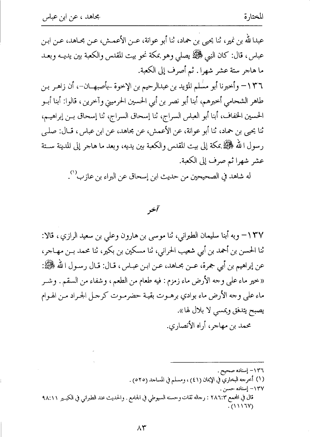 ١٣٦ - وَأَخْبَرَنَا أَبُو مُسْلِمٍ الْمُؤَيَّدُ بْنُ عَبْدِ الرَّحِيمِ بْنِ الْإِخْوَةِ - بِأَصْبَهَانَ - أَنَّ زَاهِرَ بْنَ ظَاهِرٍ الشَّحَّامِيَّ (¬١) أَخْبَرَهُمْ، أَبْنَا أَبُو نَصْرِ بْنُ أَبِي الْحُسَيْنِ الْحَرَمِينِيُّ وَآخَرِينَ، قَالُوا: أَبْنَا أَبُو الْحُسَيْنِ الْخَفَّافُ، أَبْنَا أَبُو الْعَبَّاسِ السَّرَّاجُ، ثَنَا إِسْحَاقُ السَّرَّاجُ، ثَنَا إِسْحَاقُ بْنُ إِبْرَاهِيمَ، ثَنَا يَحْيَى بْنُ حَمَّادٍ، ثَنَا أَبُو عَوَانَةَ، عَنِ الْأَعْمَشِ، عَنْ مُجَاهِدٍ، عَنِ ابْنِ عَبَّاسٍ، قَالَ: «صَلَّى رَسُولُ اللهِ صَلَّى اللهُ عَلَيْهِ وَسَلَّمَ بِمَكَّةَ إِلَى بَيْتِ الْمَقْدِسِ وَالْكَعْبَةُ بَيْنَ يَدَيْهِ، وَبَعْدَ مَا هَاجَرَ إِلَى الْمَدِينَةِ سِتَّةَ عَشَرَ شَهْرًا ثُمَّ صُرِفَ إِلَى الْكَعْبَةِ».