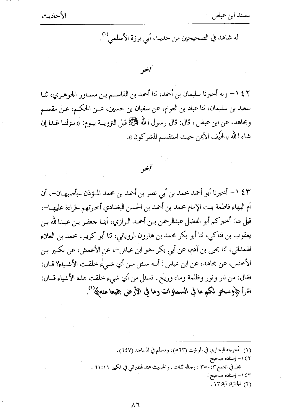 ١٤٣ - أَخْبَرَنَا أَبُو أَحْمَدَ مُحَمَّدُ بْنُ أَبِي نَصْرِ بْنِ أَحْمَدَ بْنِ مُحَمَّدٍ الْمُؤَذِّنُ - بِأَصْبَهَانَ - أَنَّ أُمَّ الْبَهَاءِ فَاطِمَةَ بِنْتَ الْإِمَامِ مُحَمَّدِ بْنِ أَحْمَدَ بْنِ الْحَسَنِ الْبَغْدَادِيِّ أَخْبَرَتْهُمْ - قِرَاءَةً عَلَيْهَا - قِيلَ لَهَا: أَخْبَرَكُمْ أَبُو الْفَضْلِ عَبْدُ الرَّحْمَنِ بْنُ أَحْمَدَ الرَّازِيُّ، أَبْنَا جَعْفَرُ بْنُ عَبْدِ اللهِ بْنِ يَعْقُوبَ بْنِ فَنَّاكِيٍّ، ثَنَا أَبُو بَكْرٍ مُحَمَّدُ بْنُ هَارُونَ الرُّويَانِيُّ، ثَنَا أَبُو كُرَيْبٍ مُحَمَّدُ بْنُ الْعَلَاءِ الْهَمْدَانِيُّ، ثَنَا يَحْيَى بْنُ آدَمَ، عَنْ أَبِي بَكْرٍ - هُوَ ابْنُ عَيَّاشٍ - عَنِ الْأَعْمَشِ، عَنْ بُكَيْرِ بْنِ الْأَخْنَسِ، عَنْ مُجَاهِدٍ، عَنِ ابْنِ عَبَّاسٍ: «أَنَّهُ سُئِلَ: مِنْ أَيِّ شَيْءٍ خُلِقَتِ الْأَشْيَاءُ؟ قَالَ: فَقَالَ: مِنْ نَارٍ وَنُورٍ وَظُلْمَةٍ وَمَاءٍ وَرِيحٍ. فَسُئِلَ: مِنْ أَيِّ شَيْءٍ خُلِقَتْ هَذِهِ الْأَشْيَاءُ؟ قَالَ: فَقَرَأَ: {وَسَخَّرَ لَكُمْ مَا فِي السَّمَاوَاتِ وَمَا فِي الأَرْضِ جَمِيعًا مِنْهُ}».