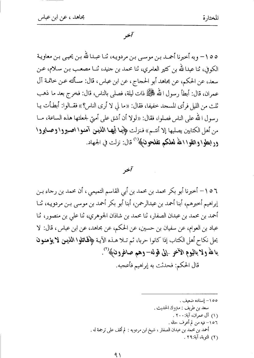 ١٥٥ - وَبِهِ أَخْبَرَنَا أَحْمَدُ بْنُ مُوسَى بْنِ مَرْدُوَيْهِ، ثَنَا عَبْدُ اللهِ بْنُ يَحْيَى بْنِ مُعَاوِيَةَ الْكُوفِيُّ، ثَنَا عَبْدُ اللهِ بْنُ كَثِيرٍ الْعَامِرِيُّ، ثَنَا مُحَمَّدُ بْنُ جُنَيْدٍ، ثَنَا مُصْعَبُ بْنُ سَلَّامٍ، عَنْ سَعْدٍ، عَنِ الْحَكَمِ، عَنْ مُجَاهِدٍ أَبُو الْحَجَّاجِ، عَنِ ابْنِ عَبَّاسٍ، قَالَ: «سَأَلْتُهُ عَنْ خَاتِمَةِ آلِ عِمْرَانَ، قَالَ: أَبْطَأَ رَسُولُ اللهِ صَلَّى اللهُ عَلَيْهِ وَسَلَّمَ ذَاتَ لَيْلَةٍ، فَصَلَّى بِالنَّاسِ، قَالَ: فَخَرَجَ بَعْدَ مَا ذَهَبَ ثُلُثٌ مِنَ اللَّيْلِ فَرَأَى الْمَسْجِدَ خَفِيفًا. فَقَالَ: مَا لِي لَا أَرَى النَّاسَ؟ فَقَالُوا: أَبْطَأْتَ يَا رَسُولَ اللهِ عَلَى النَّاسِ فَصَلُّوا، فَقَالَ: لَوْلَا أَنْ أَشُقَّ عَلَى أُمَّتِي لَجَعَلْتُهَا هَذِهِ السَّاعَةَ، مَا مِنْ أَهْلِ الْكِتَابَيْنِ يُصَلِّيهَا إِلَّا أَنْتُمْ فَنَزَلَتْ: {يَا أَيُّهَا الَّذِينَ آمَنُوا اصْبِرُوا وَصَابِرُوا وَرَابِطُوا وَاتَّقُوا اللهَ لَعَلَّكُمْ تُفْلِحُونَ} قَالَ: نَزَلَتْ فِي الْجِهَادِ».