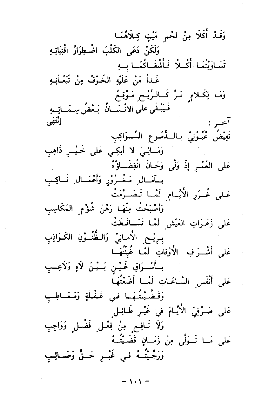 وَقَدْ أَكَلاَ مِنْ لحْمِ مَيْتٍ كِلاَهُمَا ... وَلَكَنْ دَعَا الكَلْبَ اضْطِرَارُ اقْتِيَاتِهِ