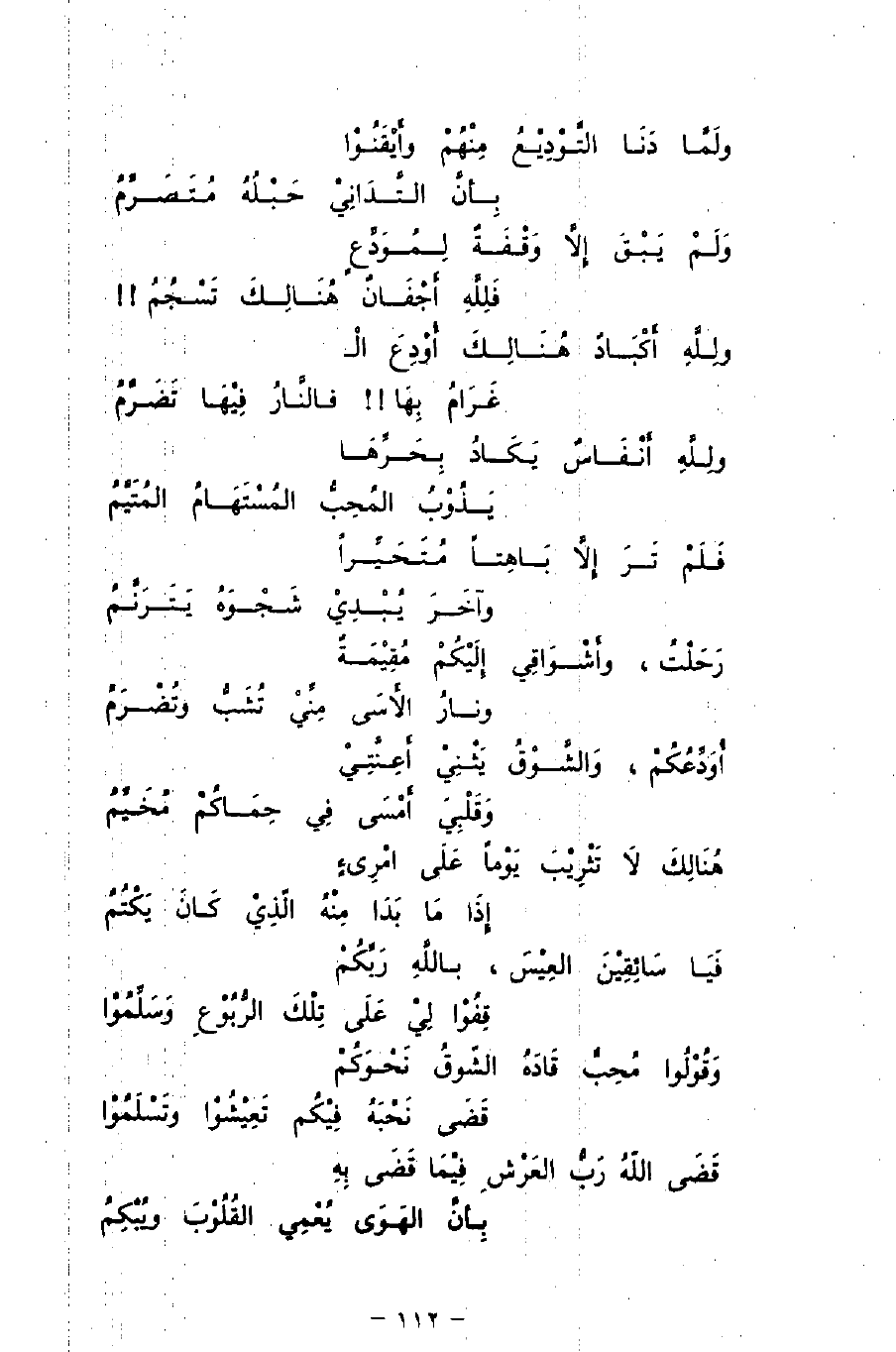 فَيَا سَائِقِيْنَ العِيْسَ، بالله رَبِّكُمْ ... قِفُوْا ليْ عَلَى تِلْكَ الرُّبُوْعِ وسَلِّمُوْا