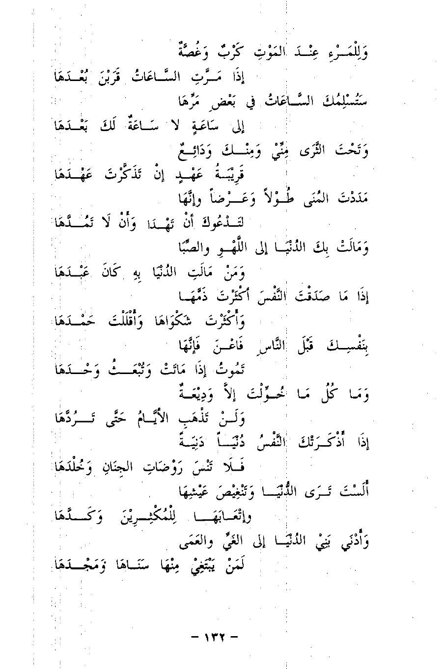 سَتُسلِمُكَ السَّاعَاتُ فِي بَعْضِ مَرِّهَا ... إِلَى سَاعَةٍ لاَ سَاعَةٌ لَكْ بَعْدَهَا