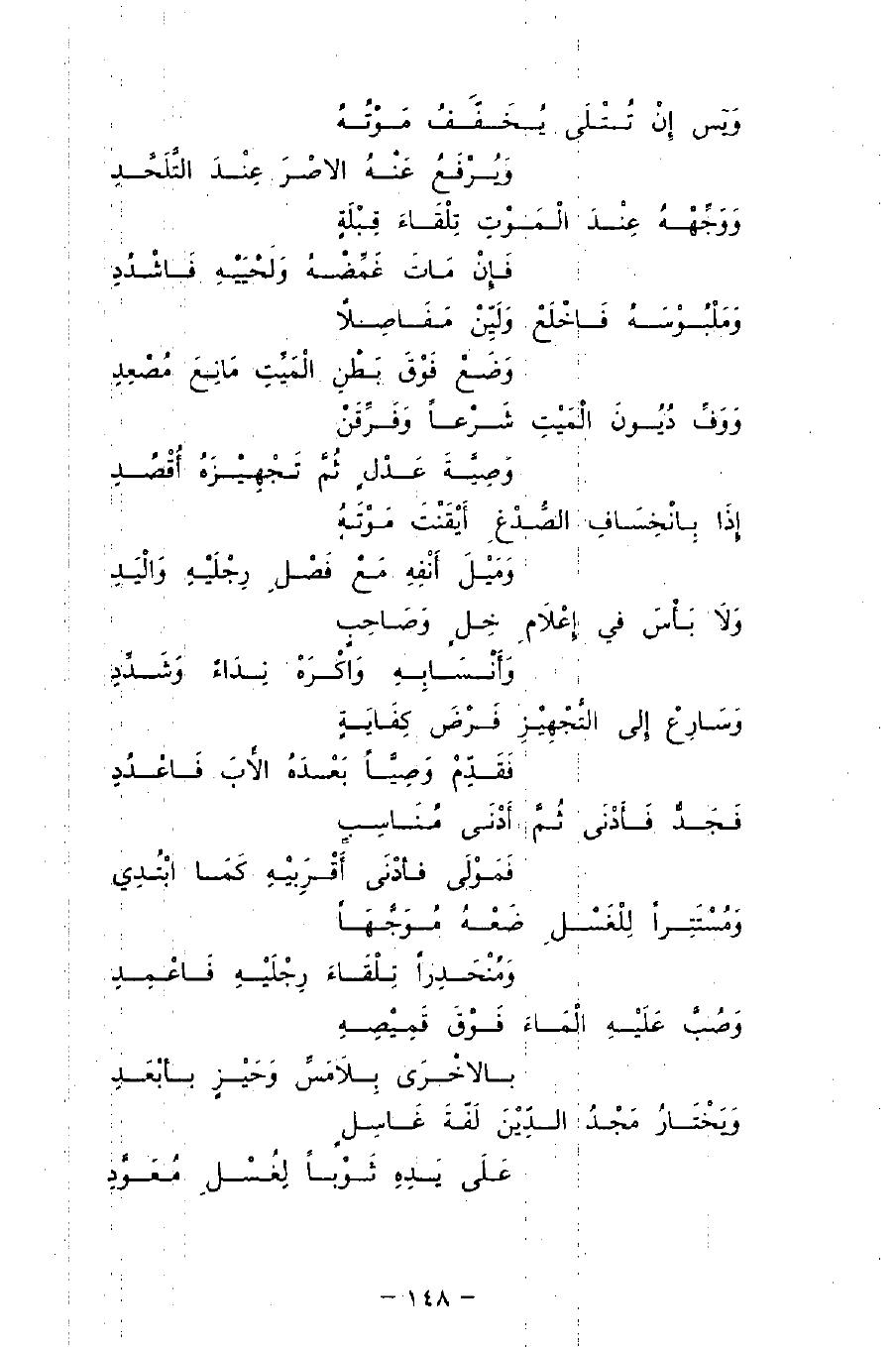 وَوَجِّهْهُ عِنْدَ الْمَوْتِ تِلْقَاءَ قِبْلَةٍ ... فَإِنْ مَاتَ غَمِّضْهُ وَلَحْيَيْهِ فَاشْدُدِ