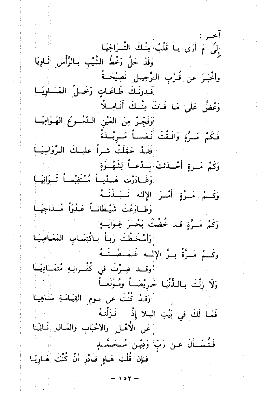 إِلَى مَتى أَرَى يا قَلْبُ مِنْكَ التَّرَاخِيَا ... وَقَدْ حَلَّ وَخَطُّ الشَّيْبِ بالرَّأْسِ ثَاوِيَا