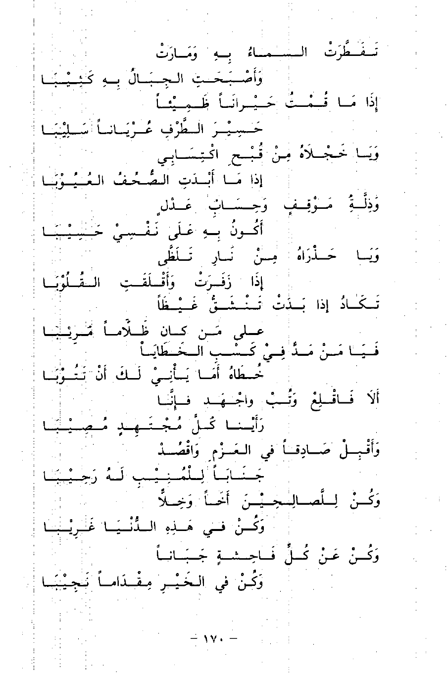وَكُنْ لِلصَّالِحِينَ أَخًا وَخِلًّا ... وَكُنْ فِي هَذِهِ الدُّنْيَا غَرِيبَا