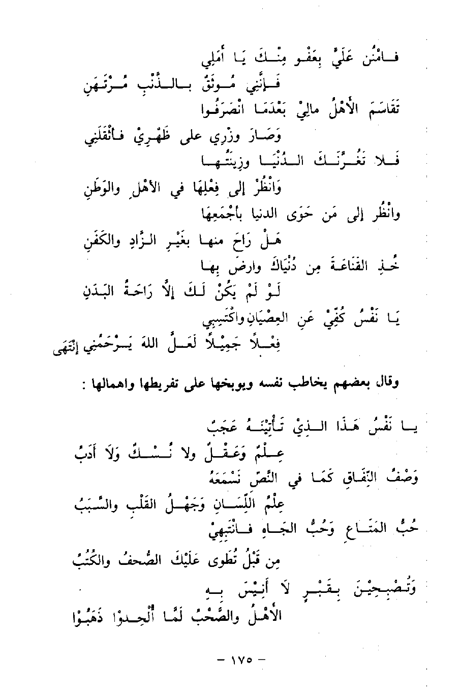 يَا نَفْسُ هَذَا الَّذِي تَأْتِينَهُ عَجَبٌ ... عِلْمٌ وَعَقْلٌ وَلَا نُسكٌ وَلَا أَدَبُ