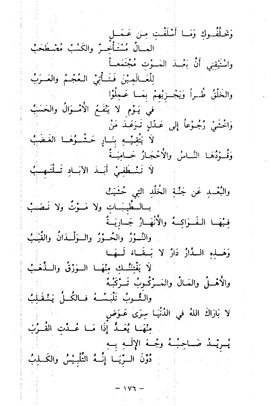 وَهَذِهِ الدَّارُ دَارٌ لَا بَقَاءَ لَهَا ... لَا يَفْتِننَّكَ مِنْهَا الْوَرِقُ وَالذَّهَبُ