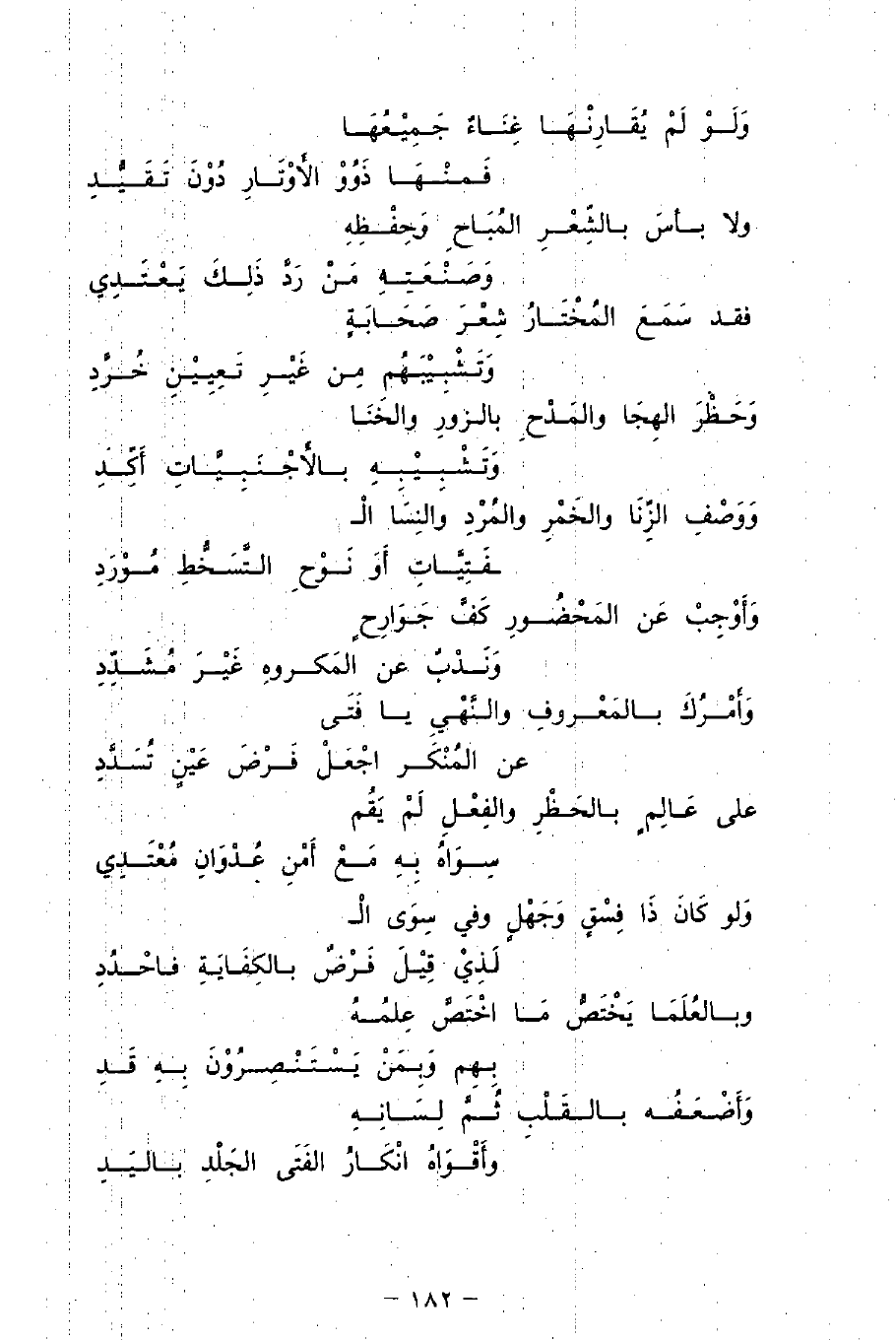 وَأَمْرُك بِالمَعْروفِ وَالنَّهْي يا فَتَى ... عن المُنْكَرِ اجْعَلْ فَرْضَ عَيْنٍ تُسَدَّدِ