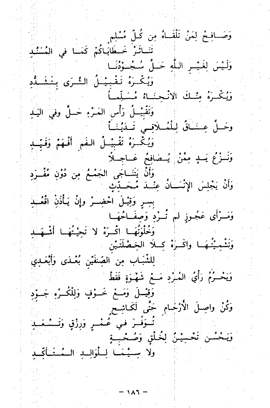 وَصَافِحْ لِمَنْ تَلْقَاهُ مِن كُلِّ مُسْلِمٍ ... تَنَاثَرْ خَطَايَاكُمْ كَمَا في المُسَنَّدِ