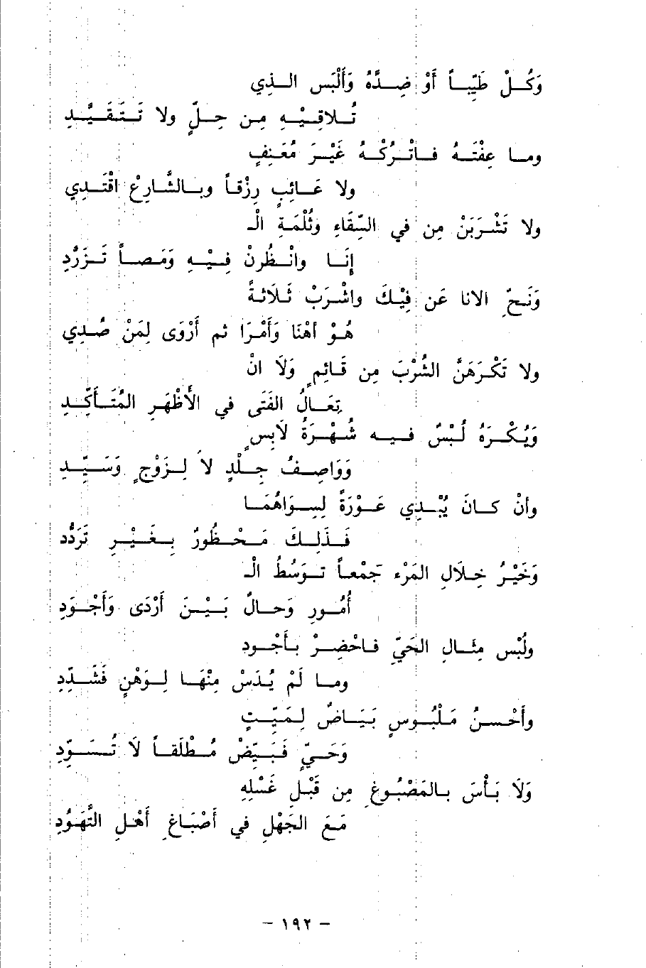 وَكُلْ طَيِّبًا أَوْ ضِدَّهُ وَالْبَسْ الَّذِي ... تُلَاقِيهِ مِنْ حِلٍّ وَلَا تَتَقَيَّد