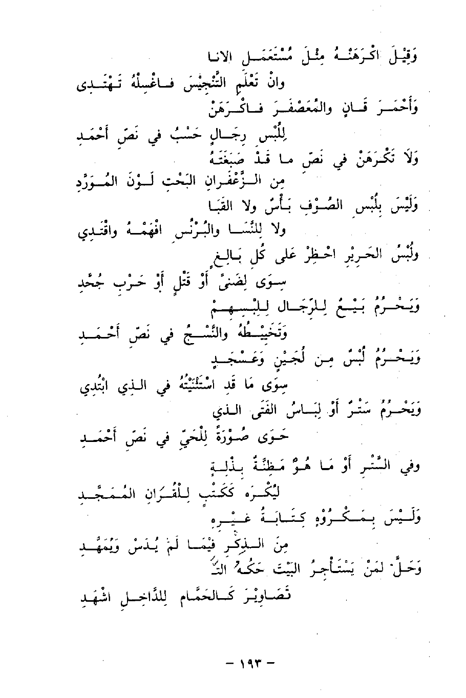 وَأَحْمَرَ قَانٍ والمُعَصْفَرَ فاكْرَهَنْ ... لِلُبْسِ رِجَالٍ حَسْبُ في نَصِّ أَحْمَدِ