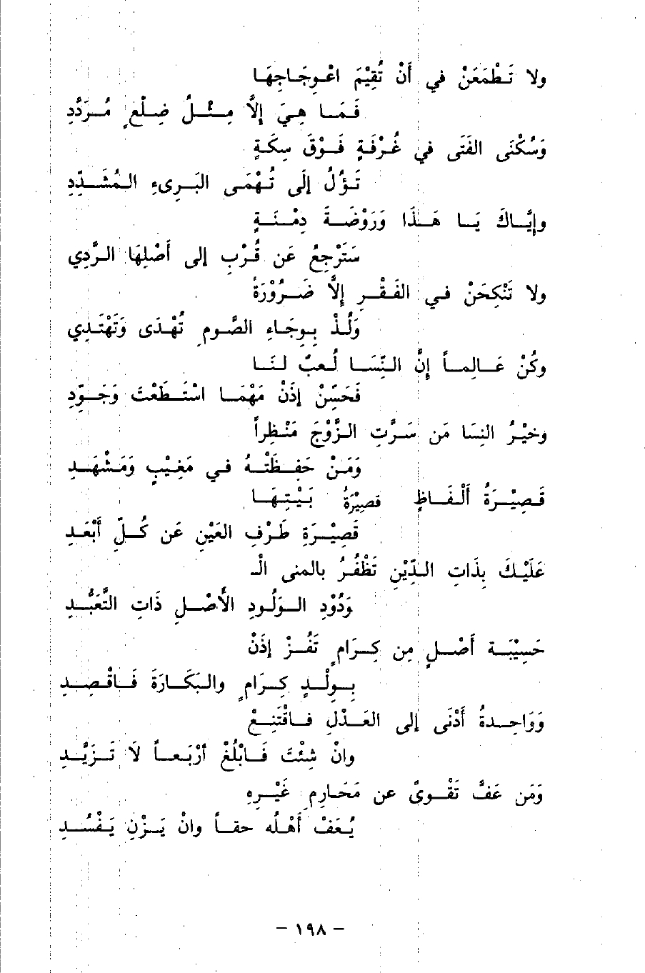 ولا تَنْكِحنَ فِي الْفَقْرِ إلَّا ضَرُورَةً ... وَلُذْ بِوِجَاءِ الصَّوْمِ تَهْدِى وَتَهْتَدِي