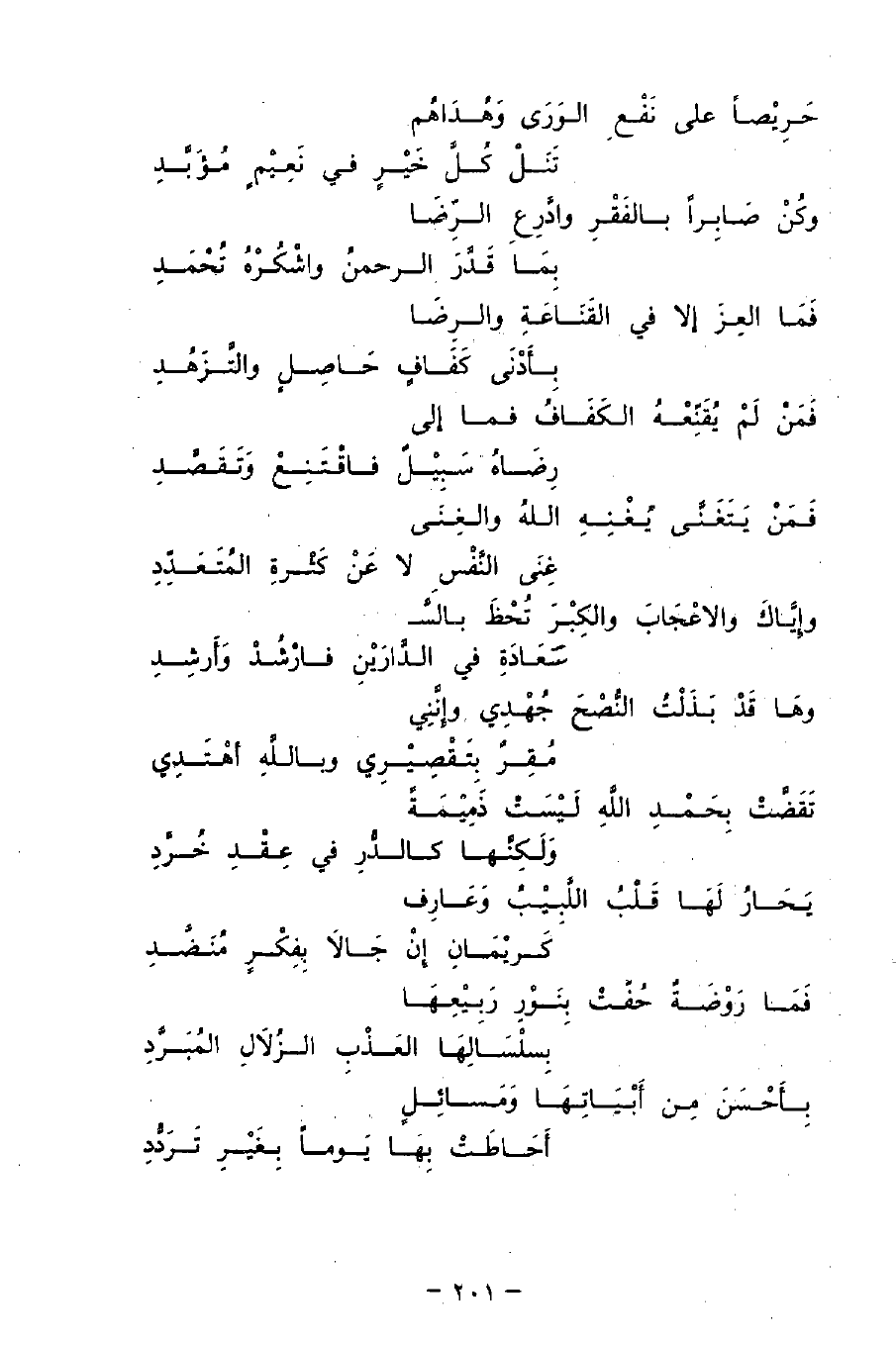 وكُنْ صَابِرًا بِالفَقْرِ وَادَّرِعِ الرِّضَا ... بمَا قَدَّرَ الرَّحمنُ وَاشْكُرْهُ تُحْمَد