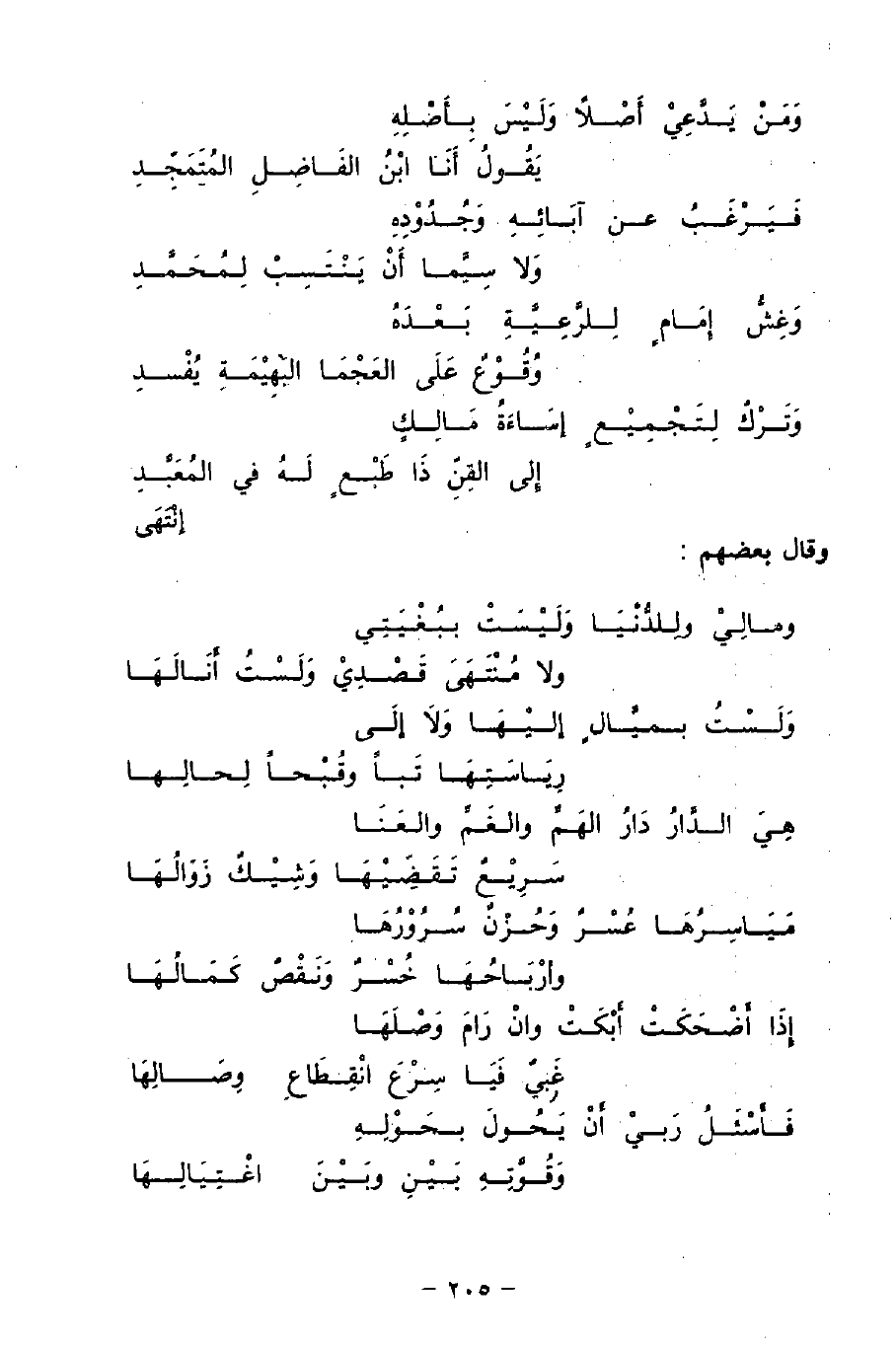 ومالِيْ ولِلدُّنْيَا وَلَيْسَتْ ببُغْيَتِي ... ولا مُنْتَهَىَ قَصْدِيْ وَلَسْتُ أَنَالَهَا