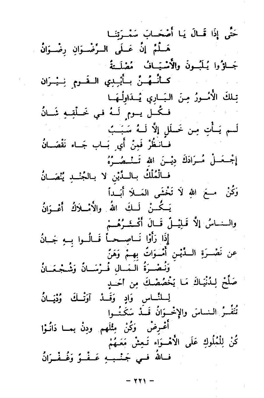 اجْعَلْ مُرَادَكَ دِيْنَ اللهِ تَنْصُرُهُ ... فالْمُلْكُ بالدِّيْنِ لا بالجُنْدِ يُنْصَانُ