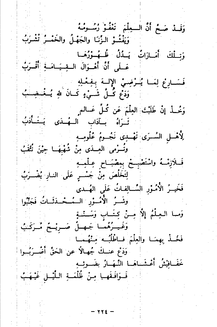 وَقَدْ صَحَّ أَنَّ العِلْمَ تَعْفُوْ رُسُومُهُ ... وَيِفْشُوْ الزِّنَا والجَهْلُ والخَمْرُ تَشْرَبُ
