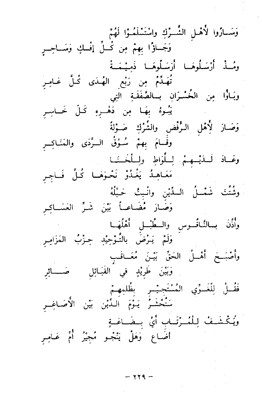 وأَذَّنَ بالنَّاقُوسِ والطَّبْلِ أَهْلُهَا ... وَلَمْ يَرْضَ بالتَّوْحِيْدِ حِزْبُ المَزَامِرِ