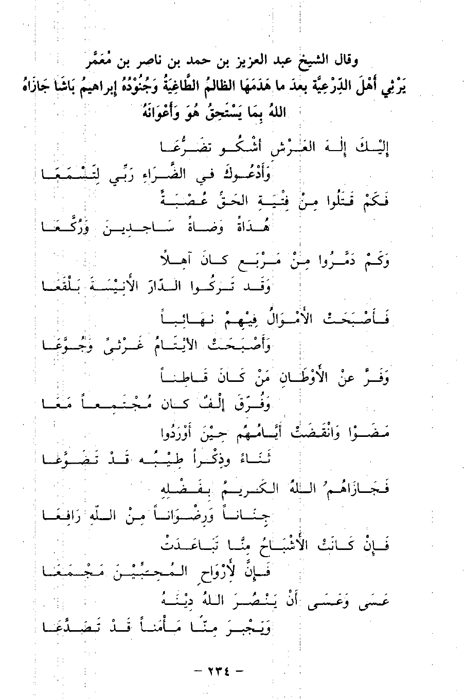 يَرْثِي أَهْلَ الدِّرْعِيَّة بعدَما هَدَمَهَا الظالمُ الطَّاغِيَةٌ وَجُنَوْدُهُ إبراهيمُ بَاشَا جَازَاهُ الله بِمَا يَسْتَحِقُ هُوَ وَأَعَوْانَهُ.