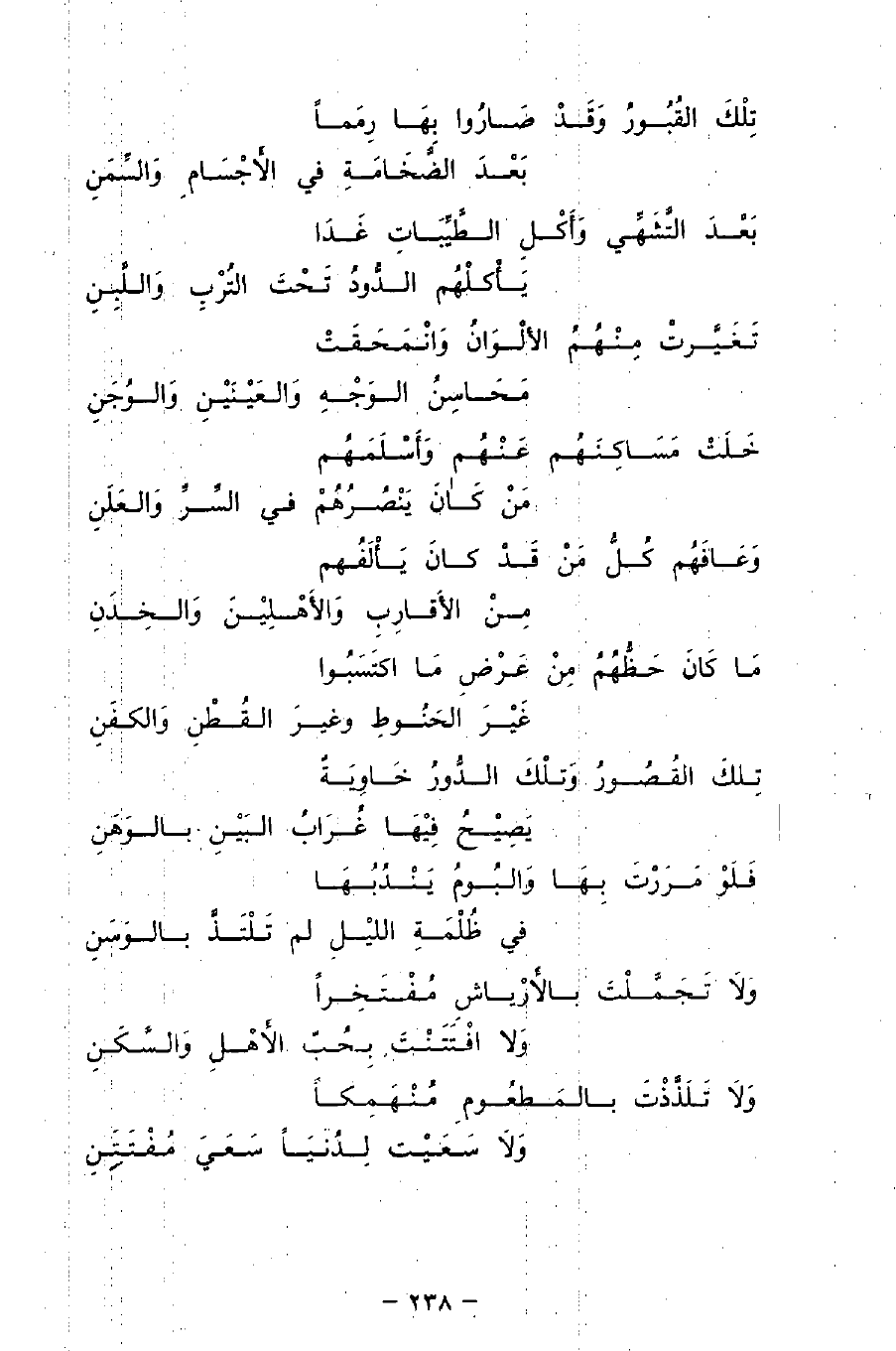 بَعْدَ التَّشَهِّي وَأَكْلِ الطَّيِّبَاتِ غَدَا ... يَأْكلْهُم الدُّودُ تَحْتَ التُرْبِ وَاللَّبِنِ