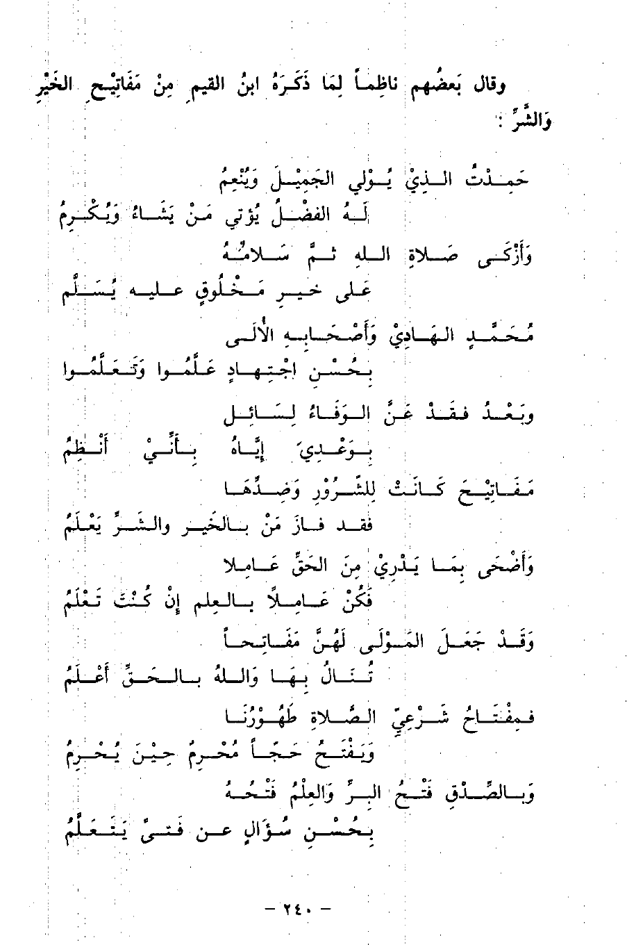 وقال بَعضُهم ناظِمًا لِمَا ذَكَرَهُ ابنُ القيمِ مِنْ مَفَاتِيْحِ الخَيْرِ وَالشَّرِّ:
