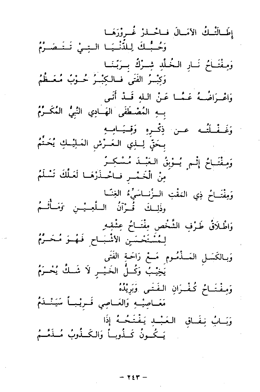 وَمِفْتَاحُ إِثْمٍ يُوْبِقُ العَبْدَ مُسْكِرٌ ... مِنْ الْخَمْرِ فاحْذَرْهَا لَعَلَّكَ تَسْلَمُ