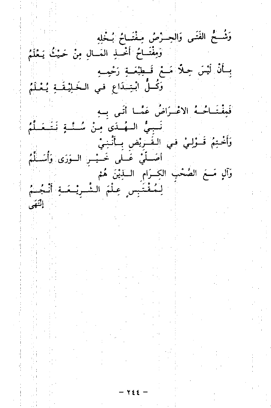 فَمِفْتَاحُهُ الإعْرَاضُ عَمَّا أتَى بِهِ ... نَبِيُّ الهُدَى مِنْ سُنَّةٍ نَتَعَلَّمُ